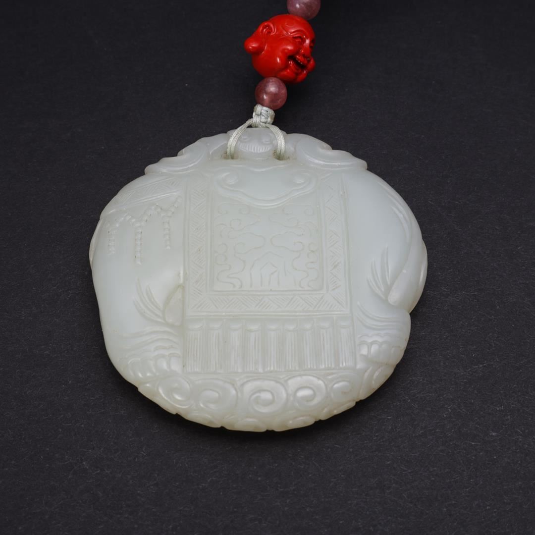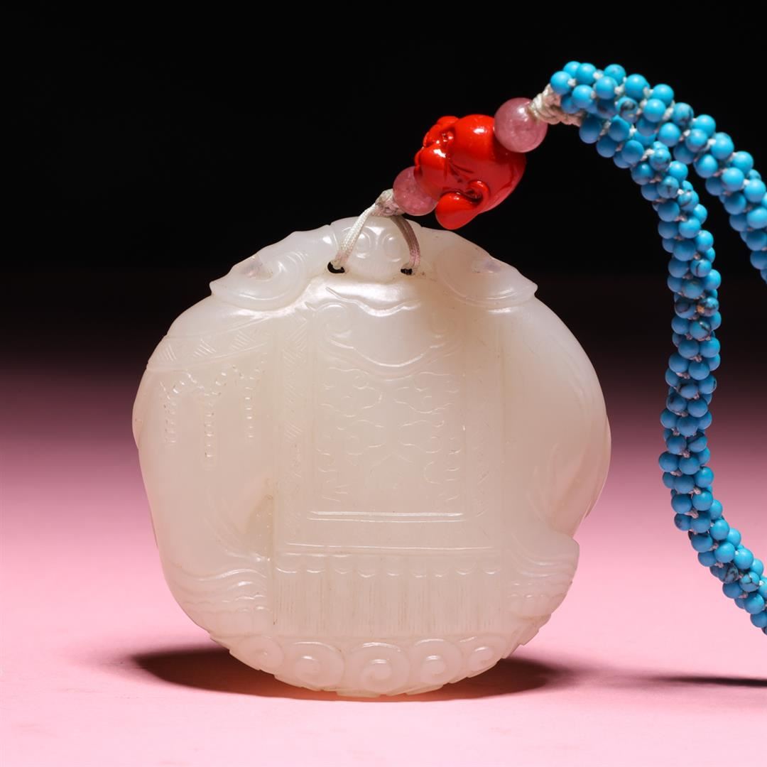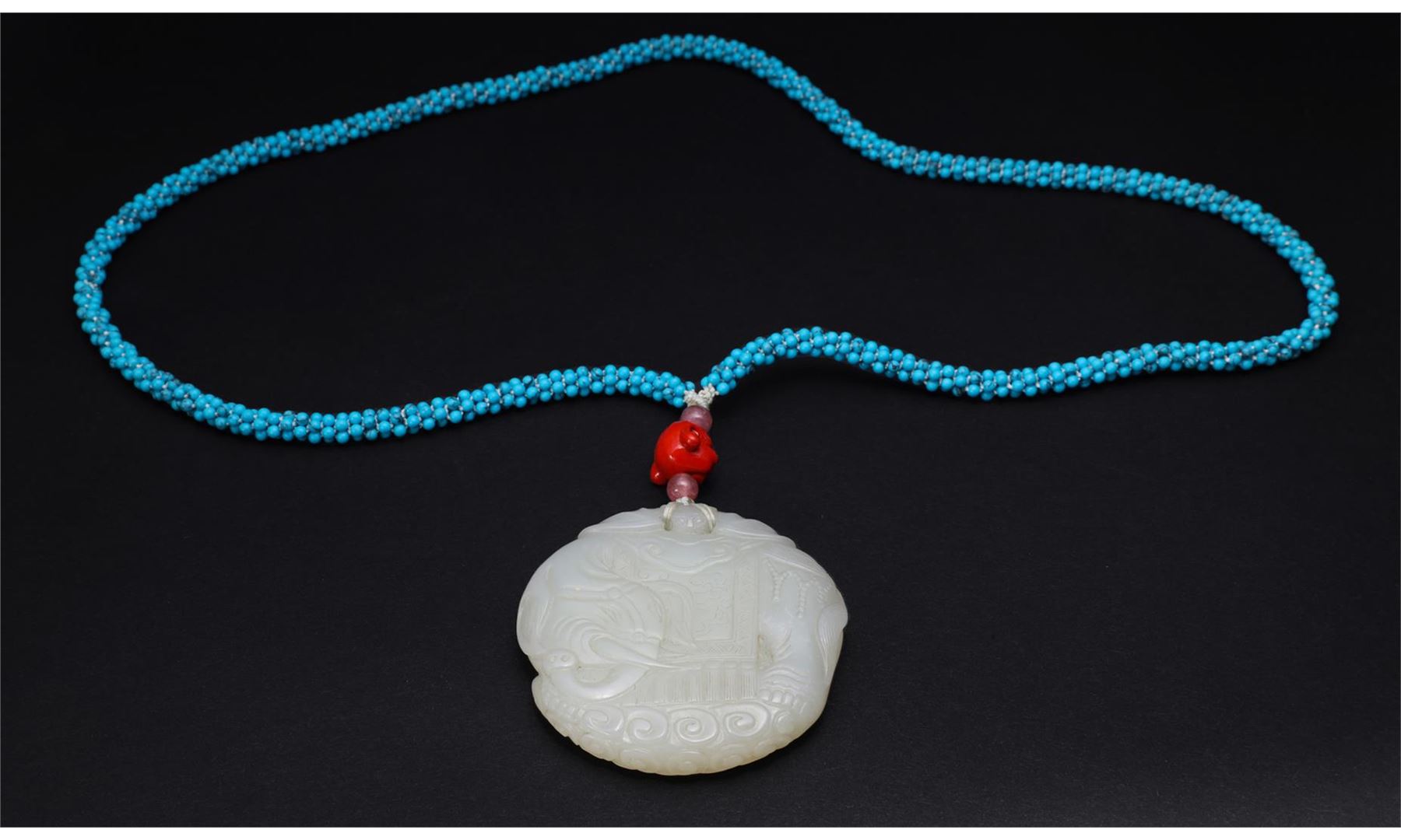 Antique Chinese, Qing Dynasty mutton fat carved Da Xing jade pei of elephant design, mounted on later turquoise bead necklace with pink tourmaline beads and glass Buddha head accents; gross weight 69.7g, the pendant 2" x 2 1/8", the necklace L 24" (approx