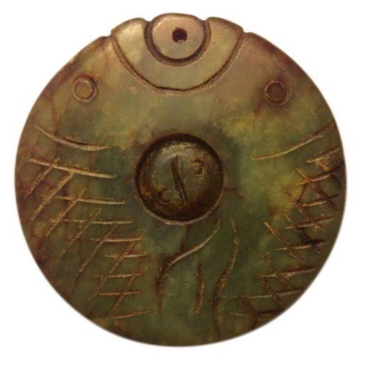 Antique Chinese jadeite two fish carved bi disk pendant. Happiness in marriage & balance medallion. Center round bead turns within disk. Â Measures approximately 2 1/4" D. 35 gram weight.Â