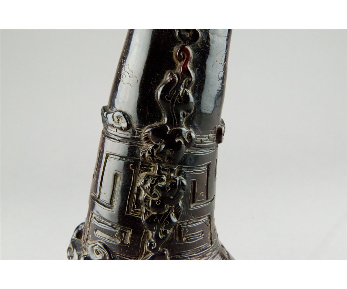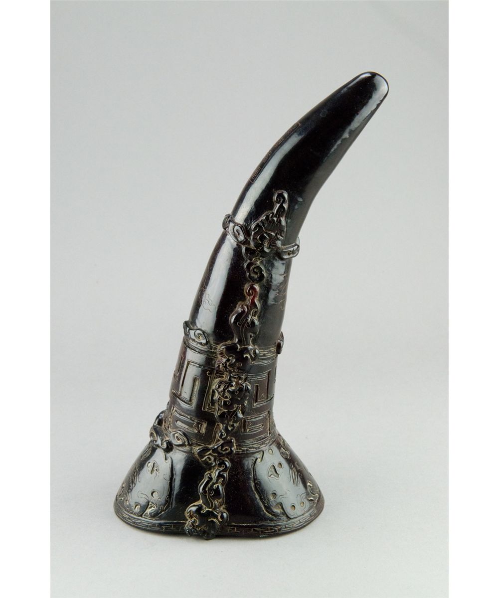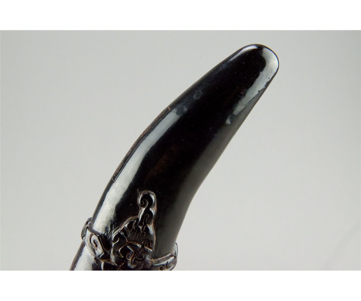 The horn shaft loosely carved with continuous and repeating scenes of dragons and motifs; 32 cm x 14 cm, 1404 grams