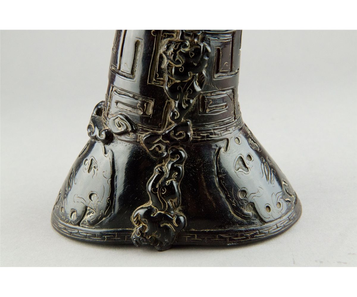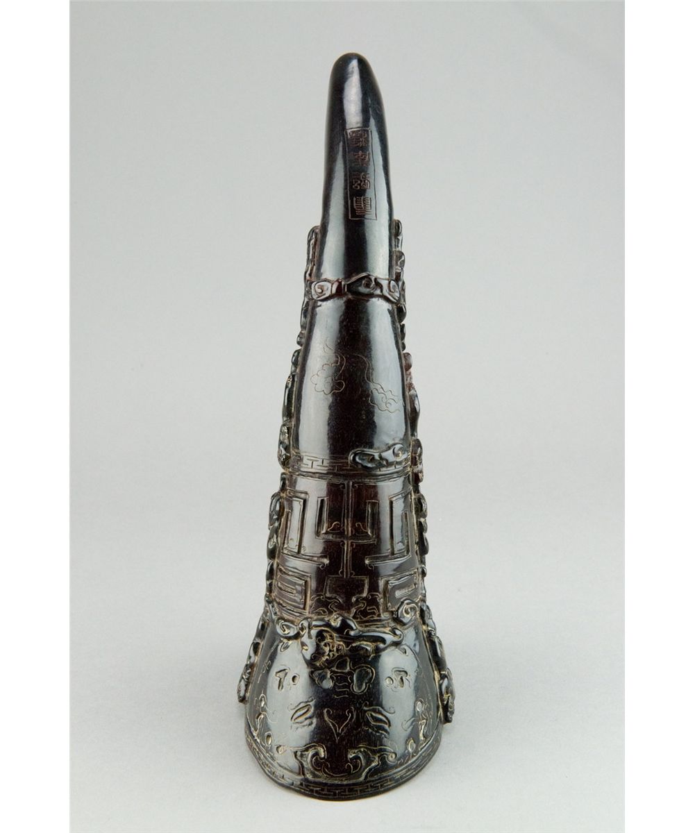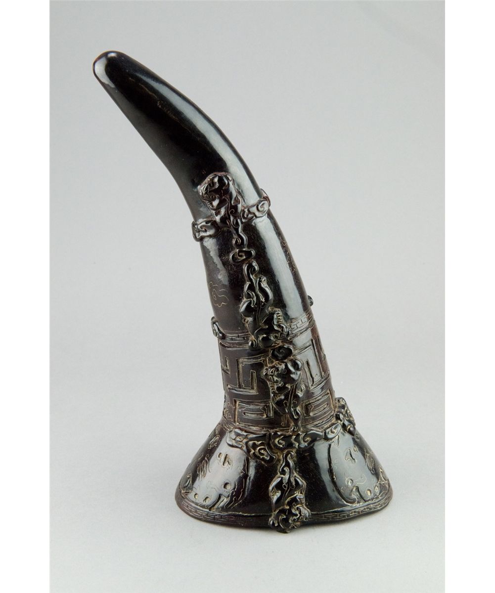 The horn shaft loosely carved with continuous and repeating scenes of dragons and motifs; 32 cm x 14 cm, 1404 grams