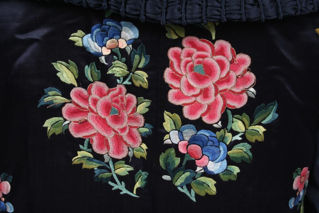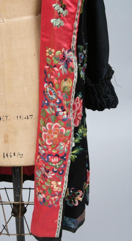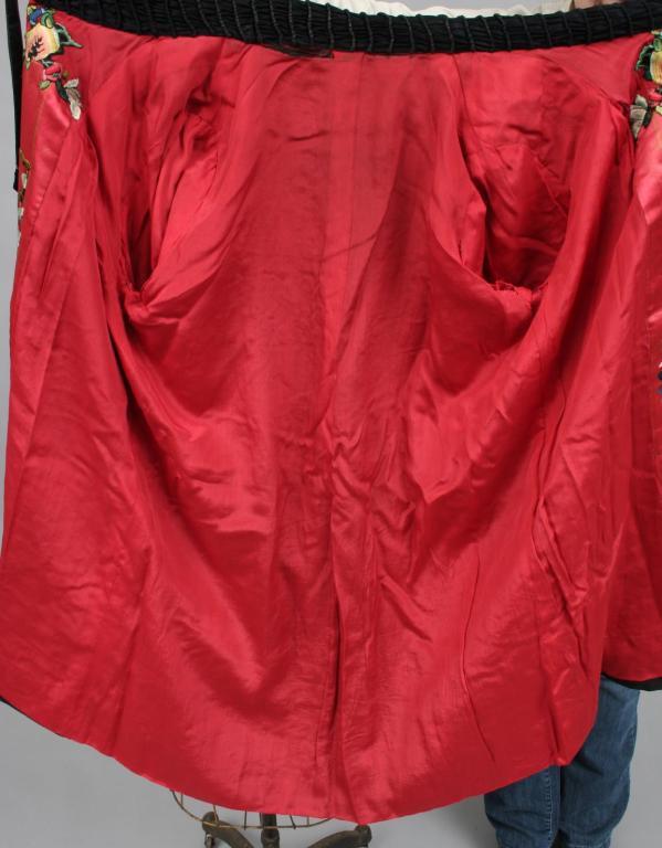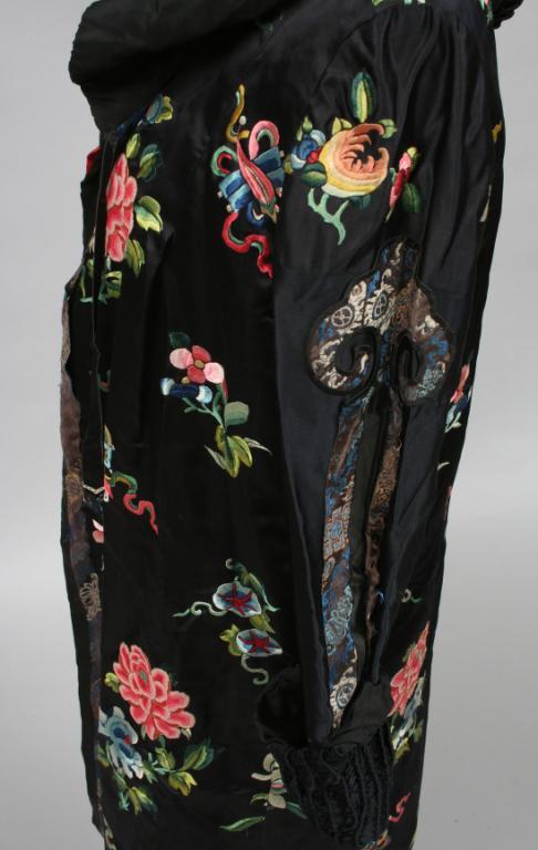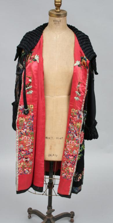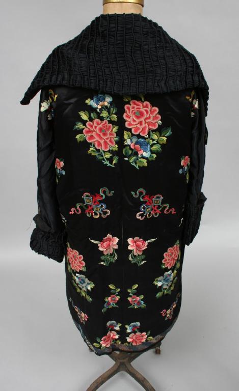 Circa 1900, the black silk coat finely embroidered with stylized Asian floral motifs, the interior placket and sleeves similarly decorated, with a ruched collar, lined in salmon colored silk. Condition: good, some light expected imperfections, textile is in fragile conditon.