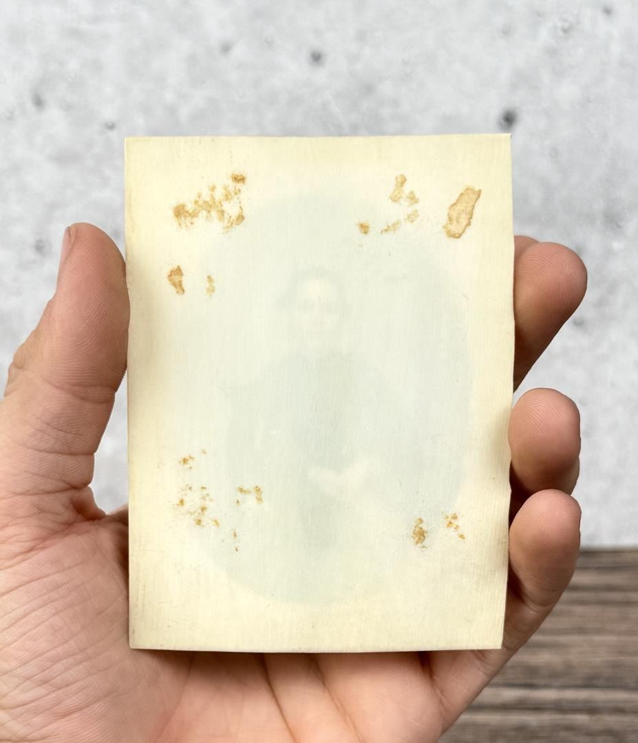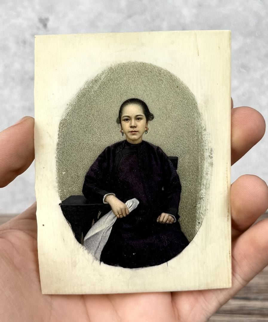 Beautiful old image. Mid 19th Century. Possibly the Work of San Francisco Chinese Artist Lai Yong. We have arrived this attribution based on the time period of the case, style of the sitter (American Chinese), format of the image to resemble a photograph, Ivory backing which would indicate an individual of status, comes from a significant collection of California history from Sacramento. 4 1/2" by 3 5/8" cased.