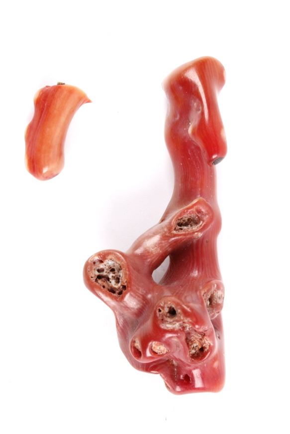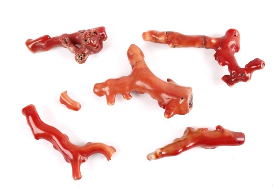 The lot features pieces of a solid red branch coral natural tree formation. These are early antique original pieces with a Chinese origin. Largest measures: 4" H x 3" W