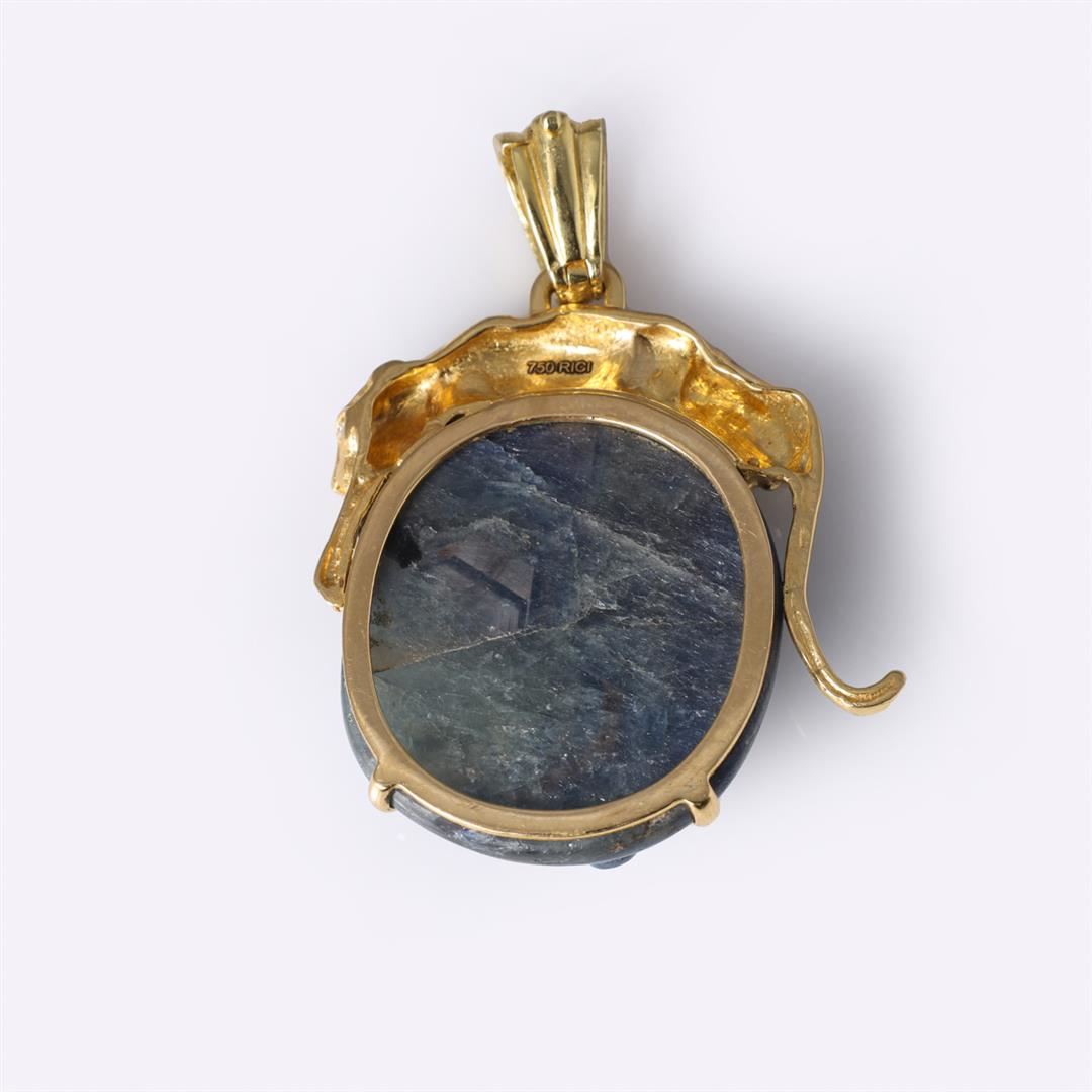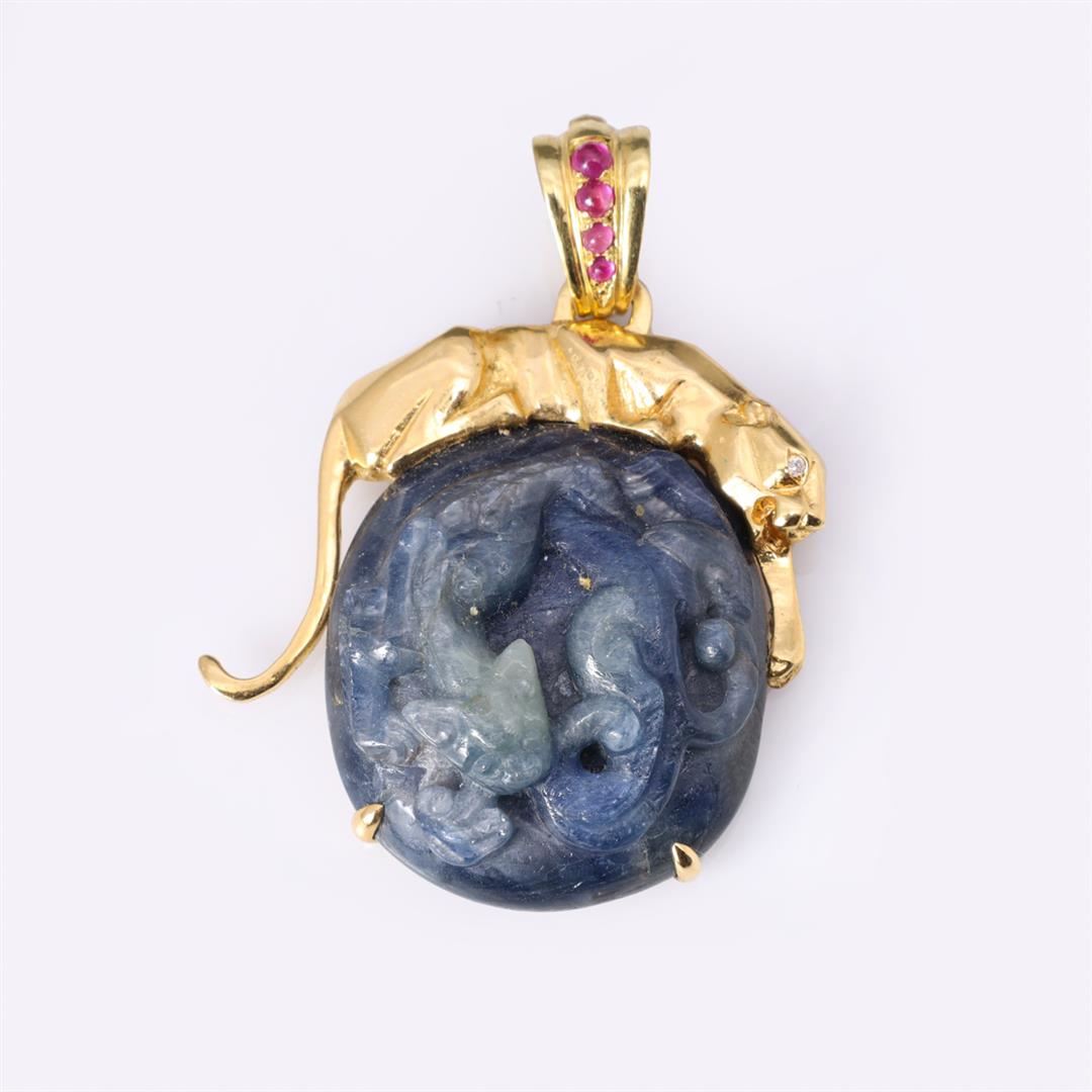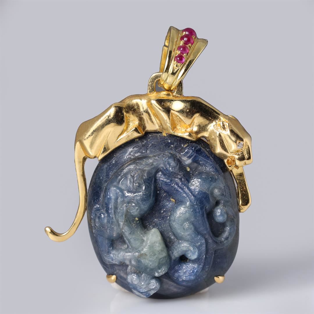 18 K Antique Chinese Sapphire & Gold Pendant by Carlo Rici containing four round rubies weighing approximately 0.10 cts. Total weight of 33.5 gm. Estimated retail value $3,800.
