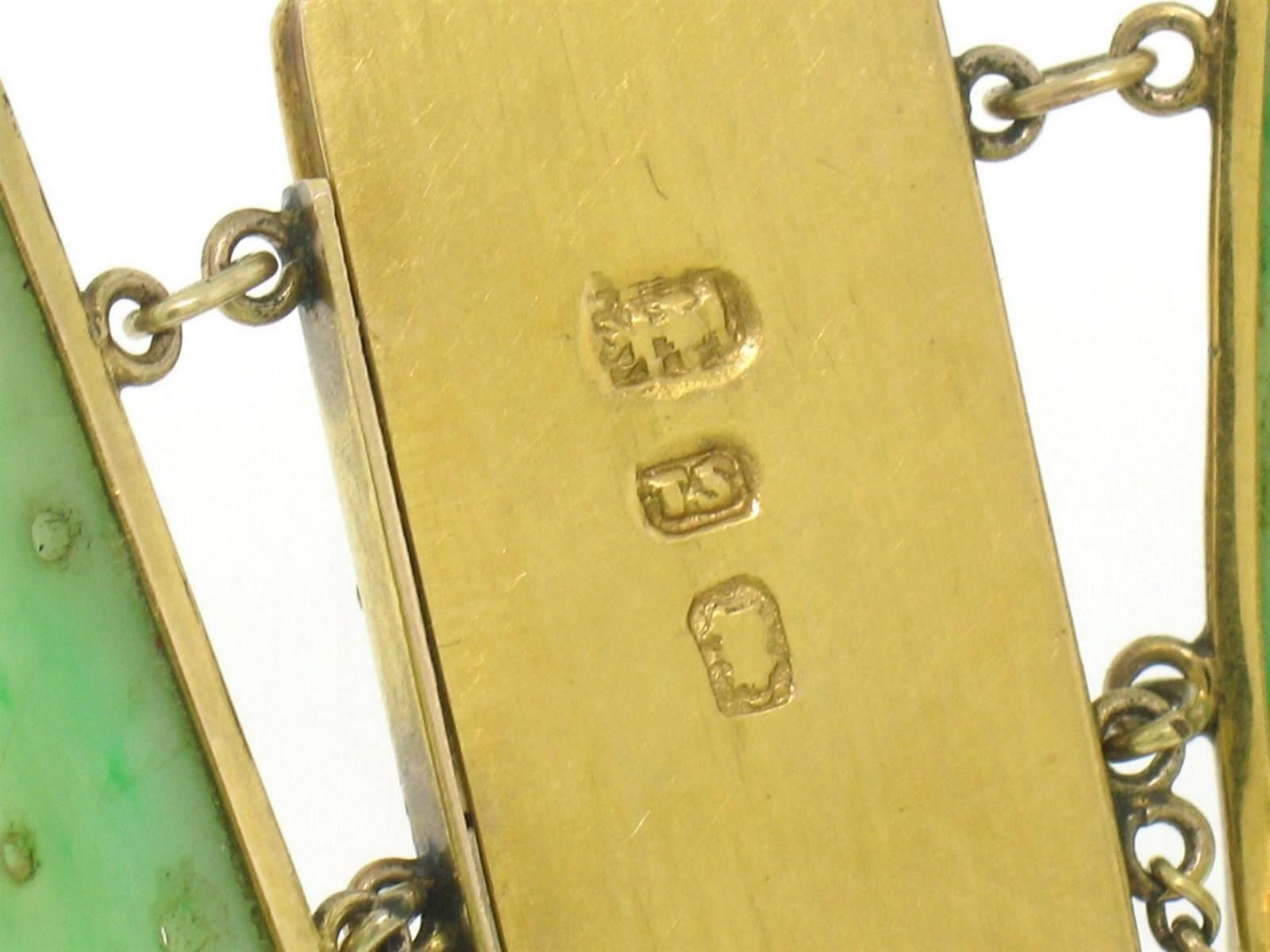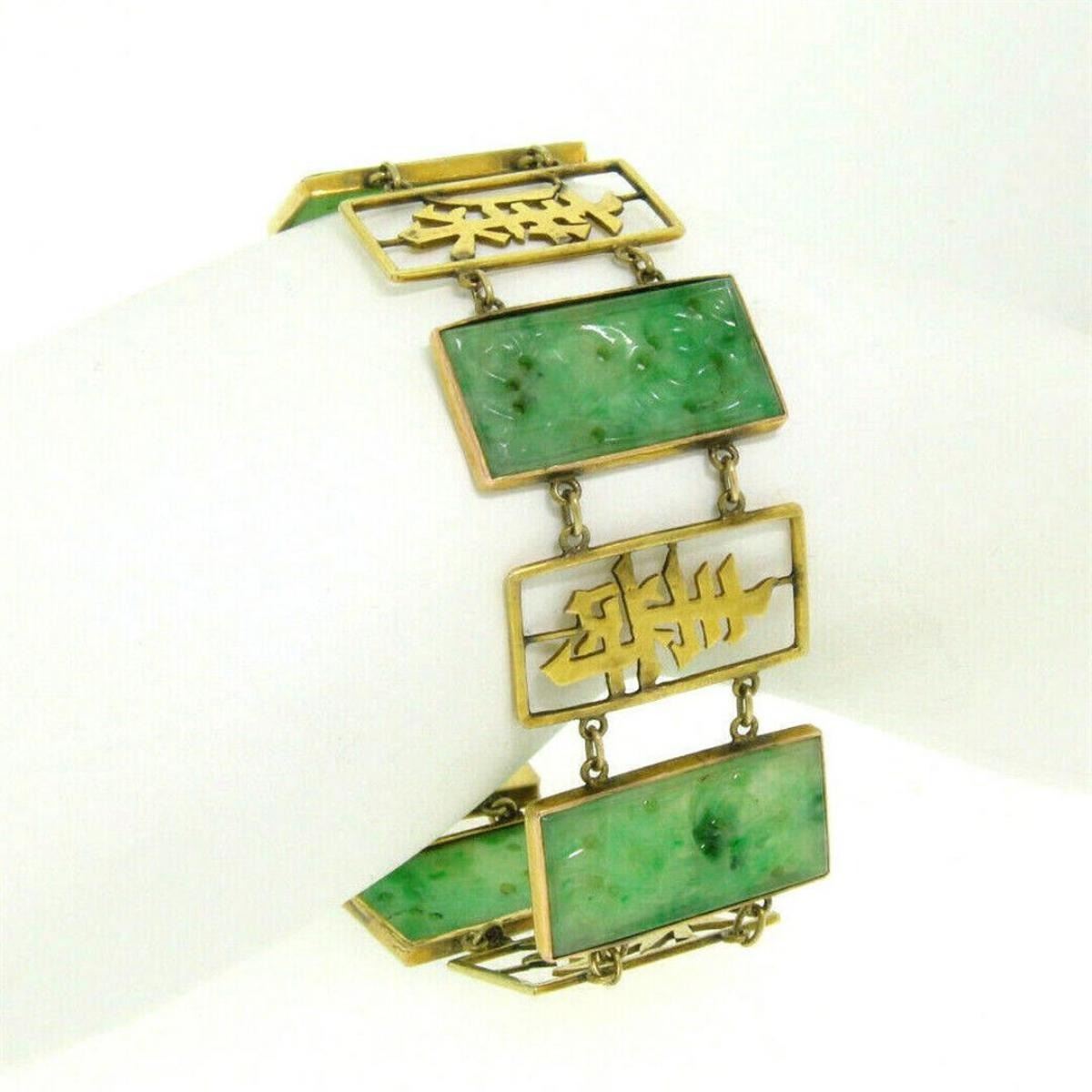 A vintage solid 14k yellow gold bracelet featuring 6 hand-carved rectangular pieces of natural green jade (24.0x12.0mm) and framed Chinese characters. It weighs a total of 21.60 grams, measures 24.25mm wide, and measures 7.25 inches in length.