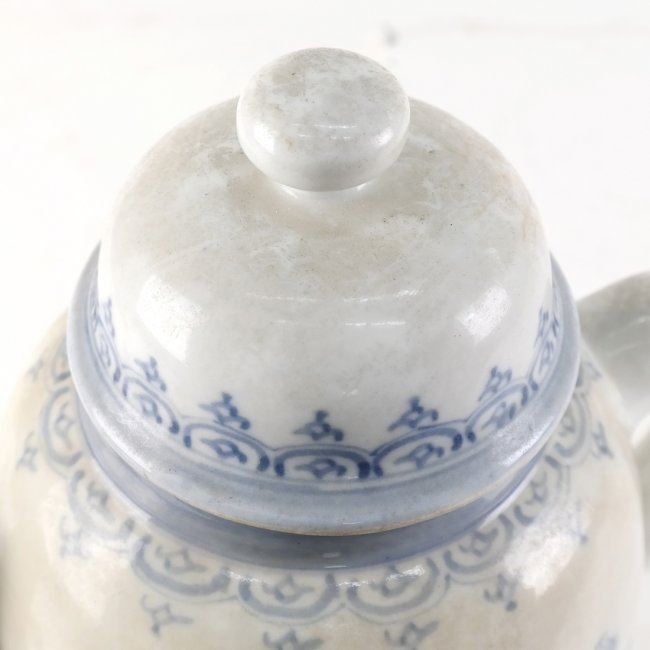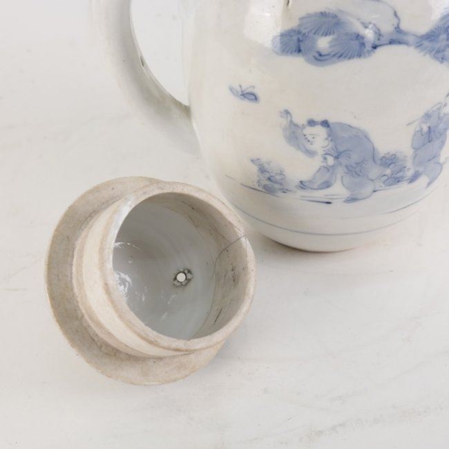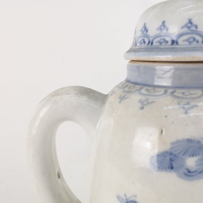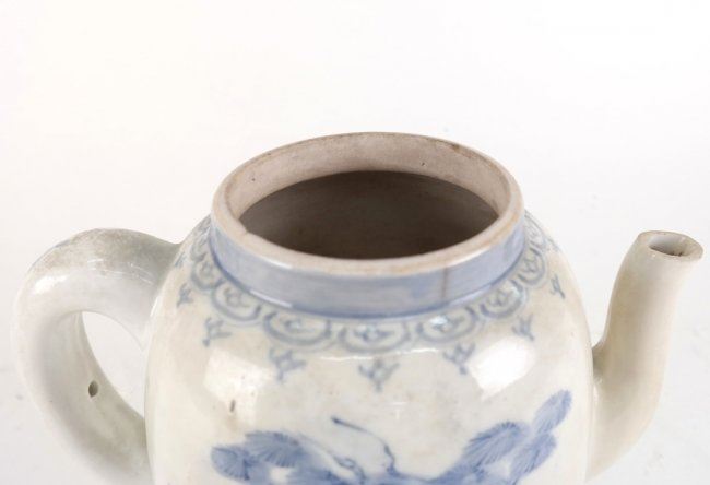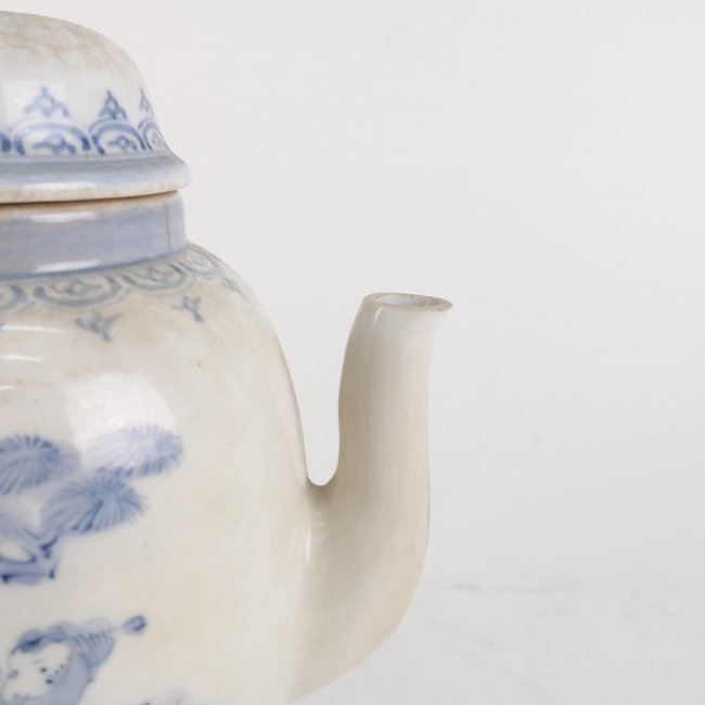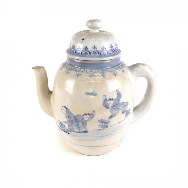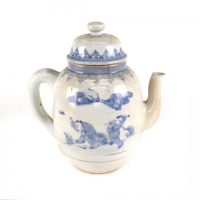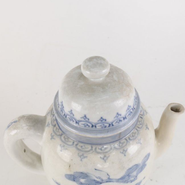 Antique blue and white Chinese teapot. [9" W x 5 1/4" x 9"]. Discoloration and crazing with cracks in the lower part of the lid that is unglazed.
