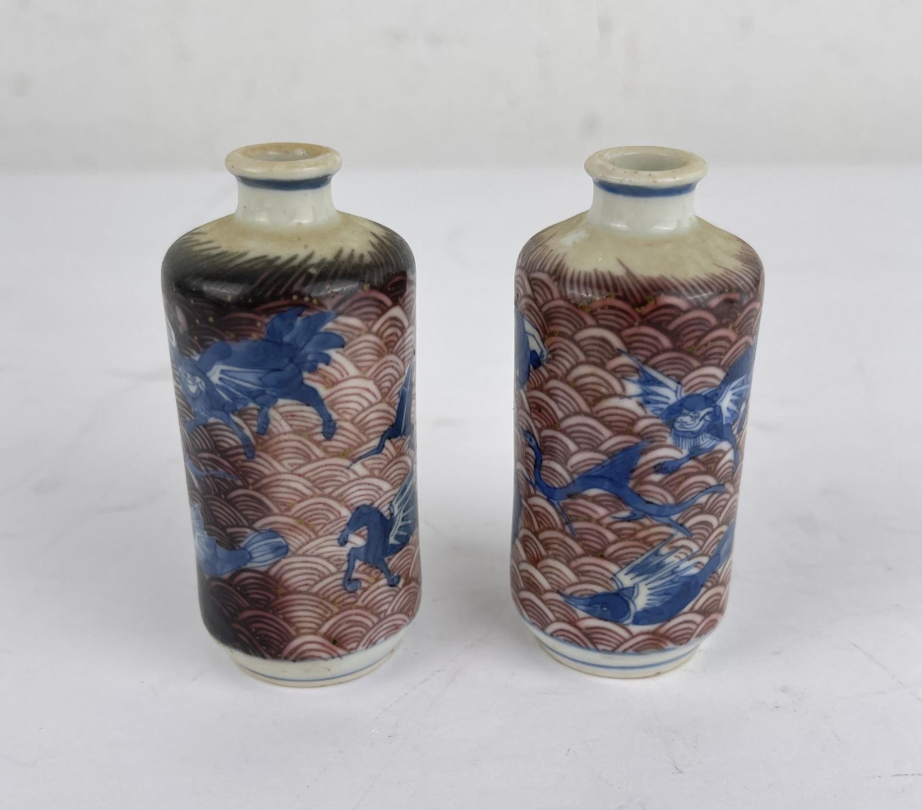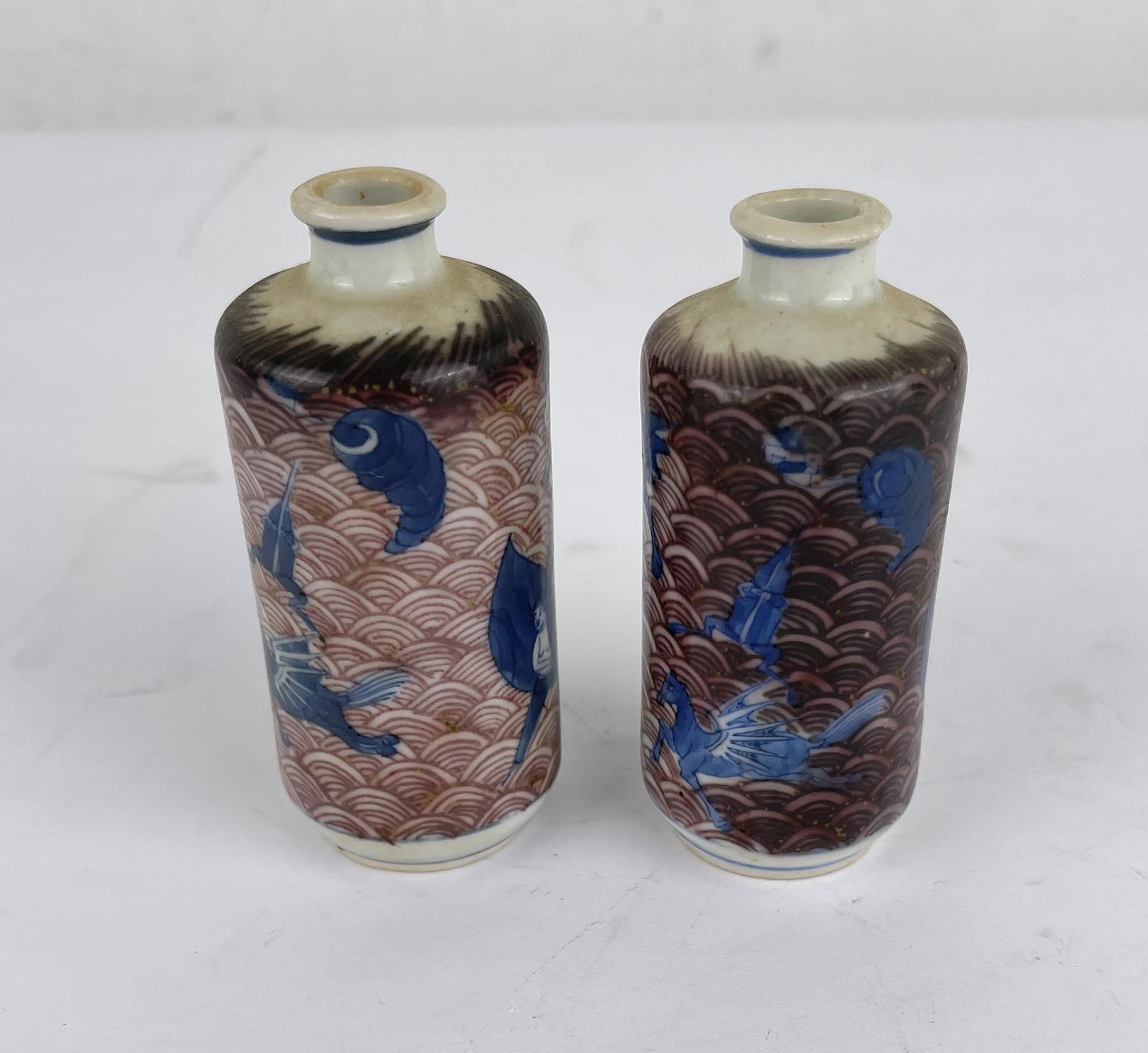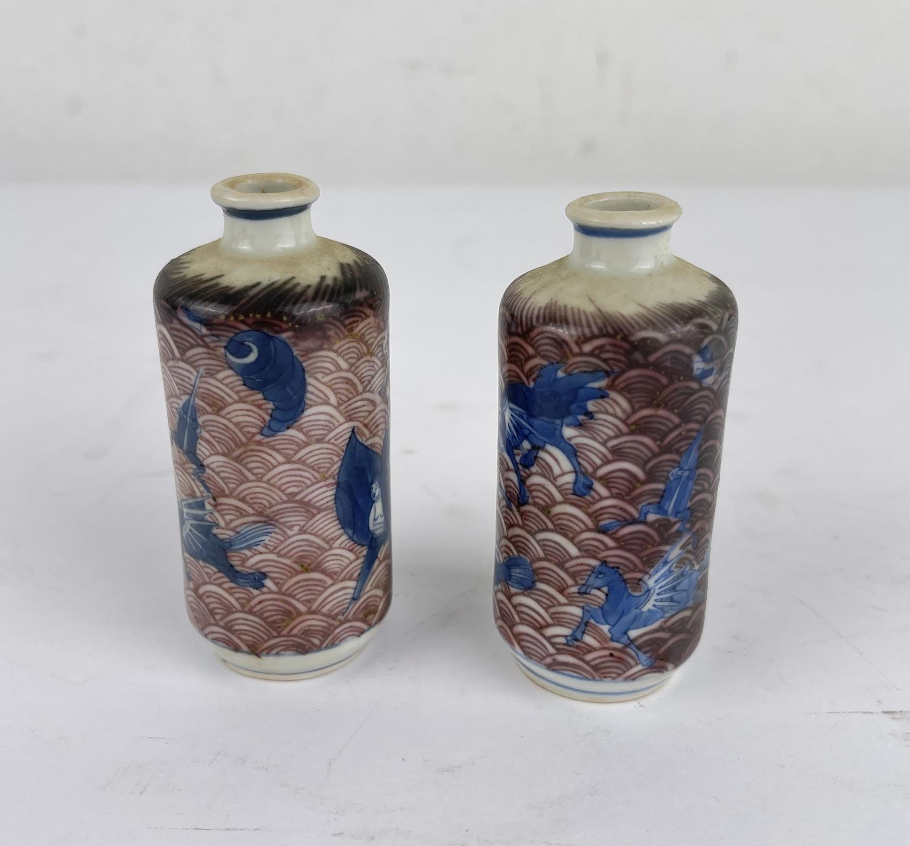 Nice old pair of snuff bottles. Blue and White with Red Underglaze. 3.25" tall.