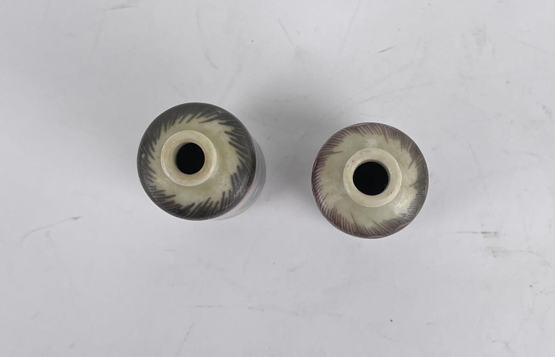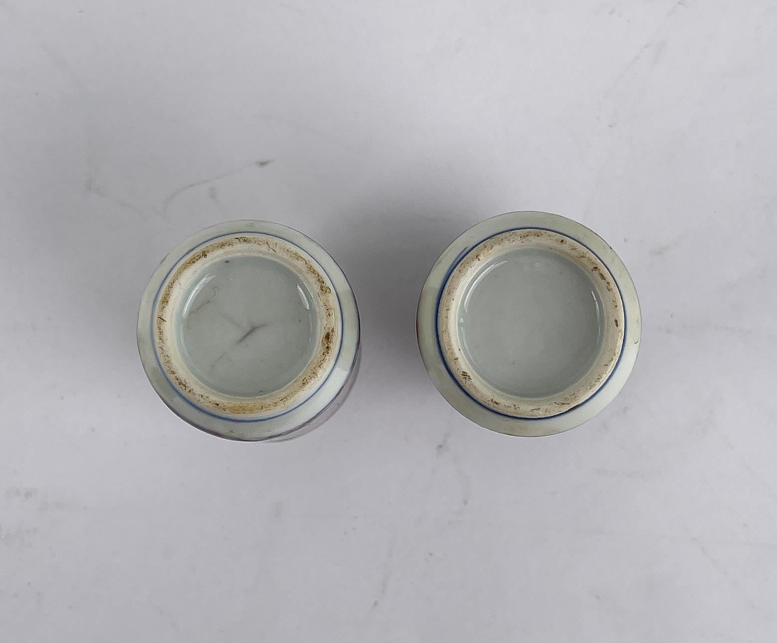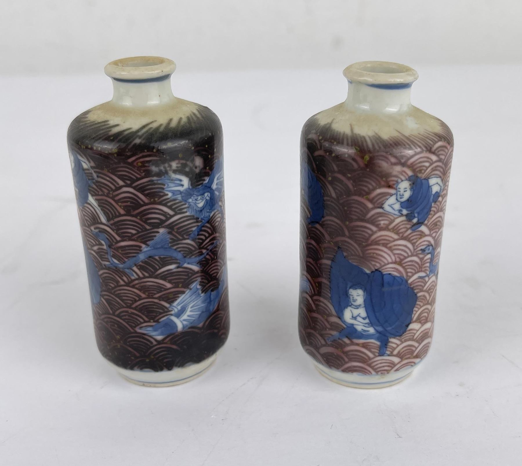 Nice old pair of snuff bottles. Blue and White with Red Underglaze. 3.25" tall.