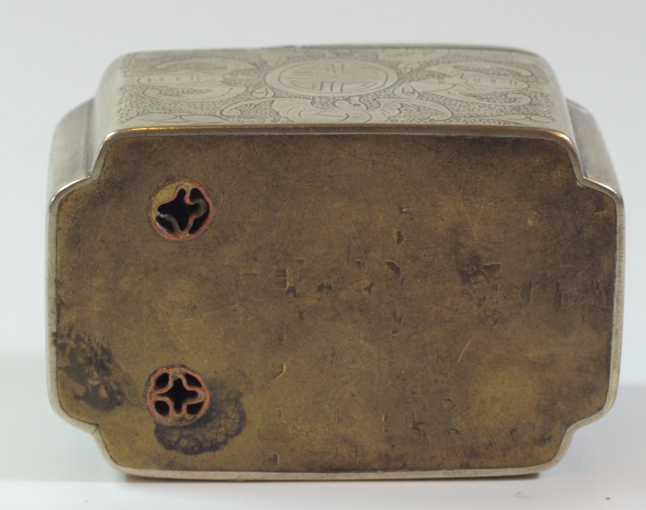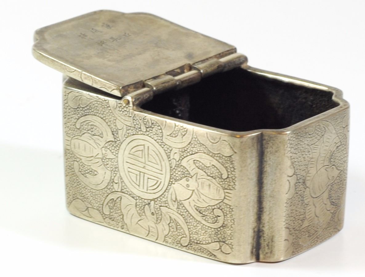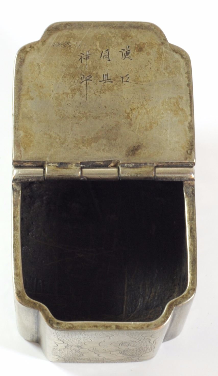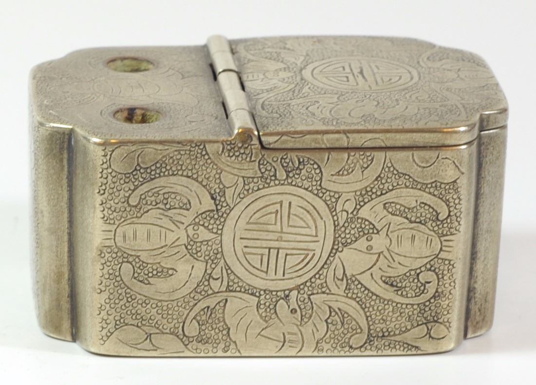 Antique Chinese calligraphy stand, silver plated brass and copper, quality hand-etched embellishments, signed, dimensions: 7X4.5X3.5 cm.