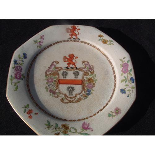 </font></strong>Mid 18th. century octagonal Chinese export porcelain dish with coat of arms decorations on the obverse side featuring a rampant lion on top of a shield. The decorations are hand painted above the glaze with polychrome enamel and gild with intricate floral pattern. Size: 8.5" X 8.5" (21.5 cm. x 21.5 cm.). Typical 18th. century glaze imperfections. Estimated retail price: $3000.</font>