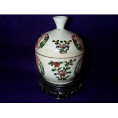 17th. Century porcelain covered container decorated with overglaze enamel handwork with floral design. Signature mark on bottom. Size: 5.5" high x 4" diameter. Intact and choice. Estimated value: $500.