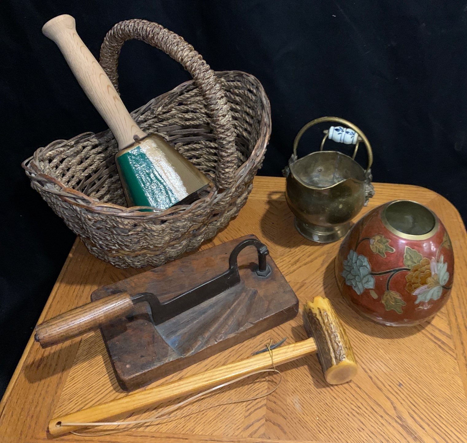 Antique Chopper w/ Chopping Board, Metal Coal Scuttle, Cow Bell, Metal Vase, and More