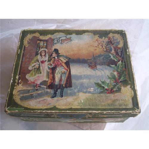 This is a wonderful early Christmas box.The little sign by the building says FINE SOAP and TOILET ARTICLES.The graphics are just beautiful.The ribbons that hold the cover open have broken and one side of the top edge has come apart at a corner.Has some wear on the outside but not really bad when you consider how old it is.These are very hard to come by.The only one I have ever had.Measures 10x8 and is 4 1/2" high.The graphics on the front and back sides looks like Jack Frost or maybe it is Old Man Winter in the picture.