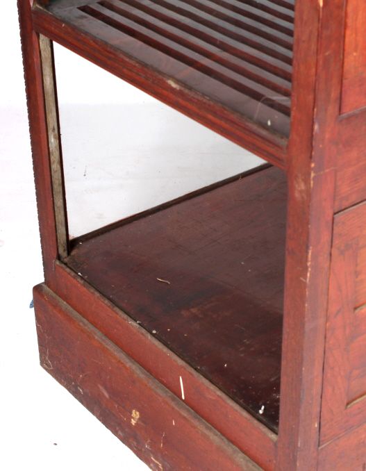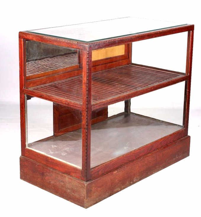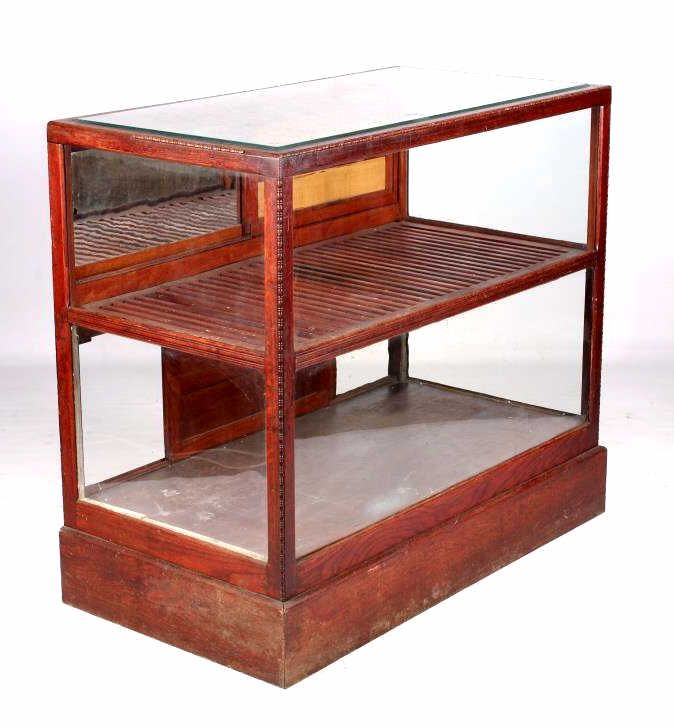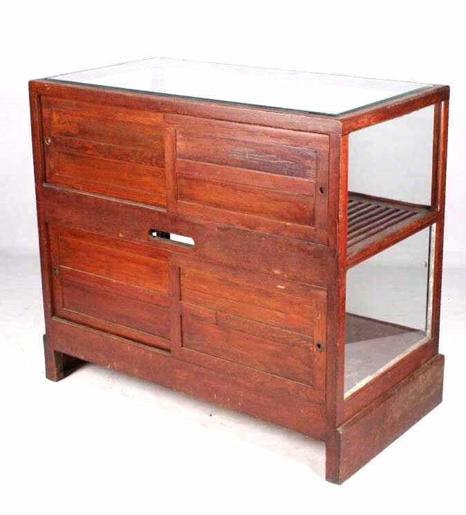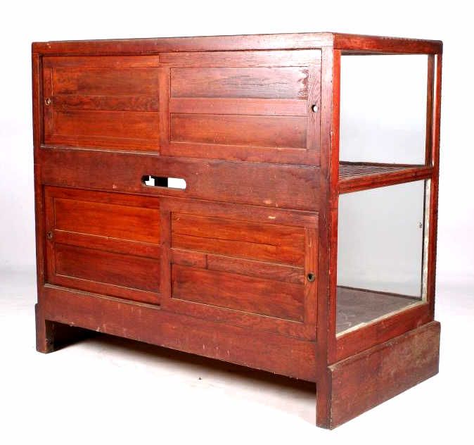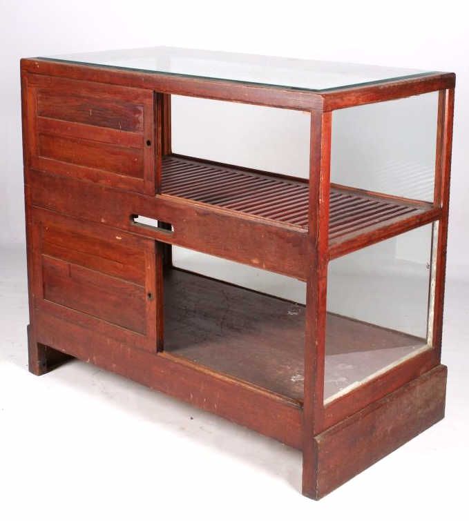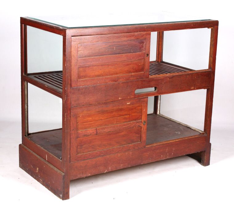 The piece shows a solid wood glass and wood antique display cabinet. The cabinet has a vented middle shelf and was used as a cigar store humidor. This is a rare piece and shows all the original glass with only the bottom right side piece missing. Measures 25"d x 47"w x 42.25"t.
