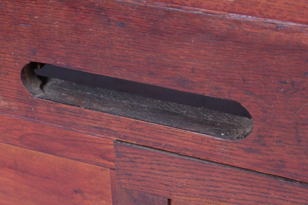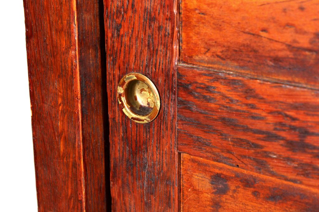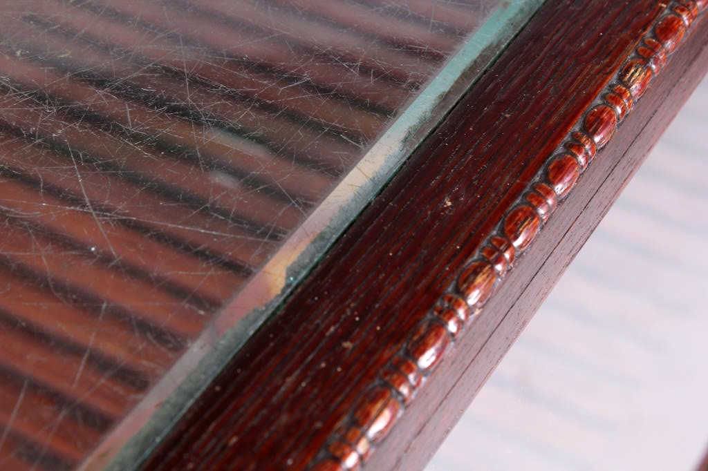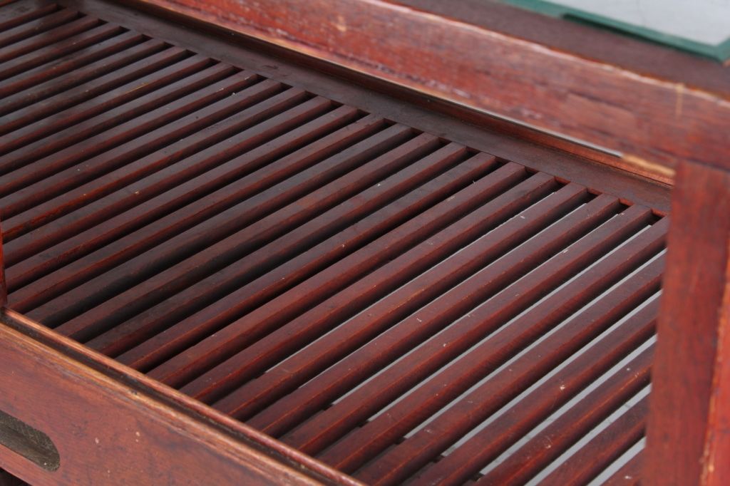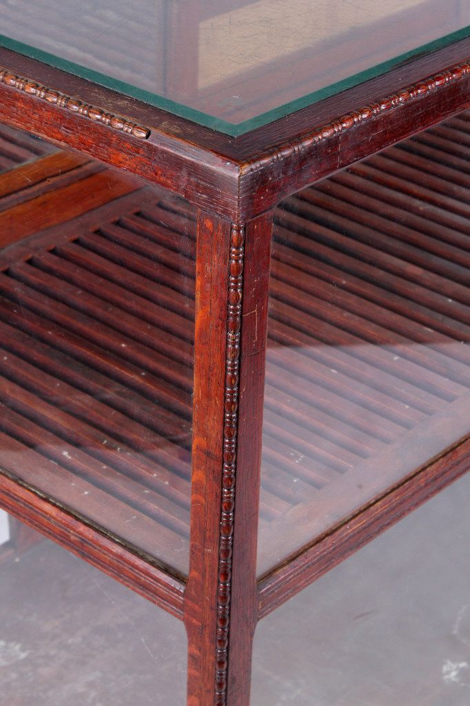 The piece shows a solid wood glass and wood antique display cabinet. The cabinet has a vented middle shelf and was used as a cigar store humidor. This is a rare piece and shows all the original glass with only the bottom right side piece missing. Measures 25"d x 47"w x 42.25"t.