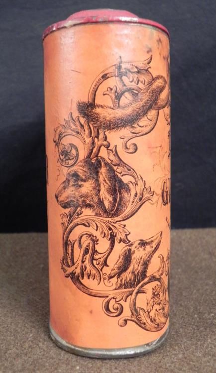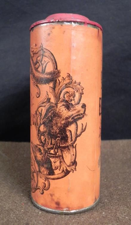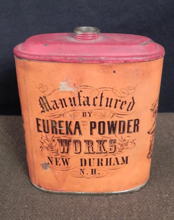 This is a Civil War era tin that once contained Imperial brand gun powder, made by Eureka Powder Works of New Hampshire. The dimensions are 4 3/4" x 4" x 1 3/4". It is made of steel with paper label covering around the rounded sides. It is dark orange wit