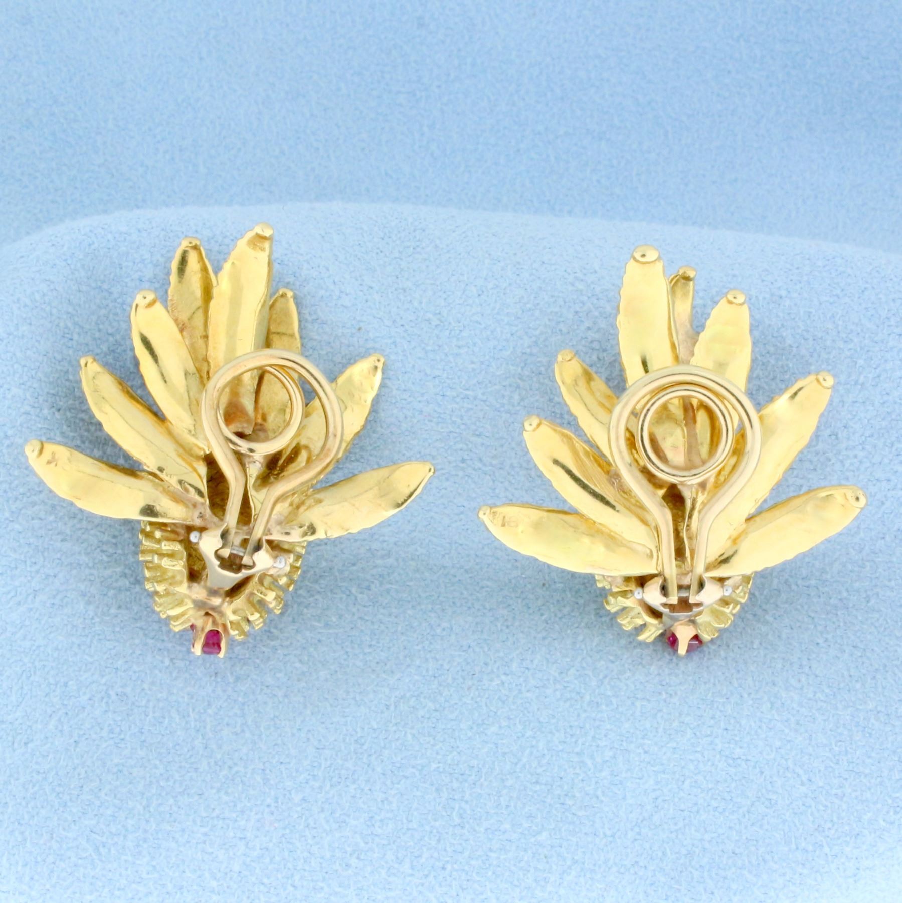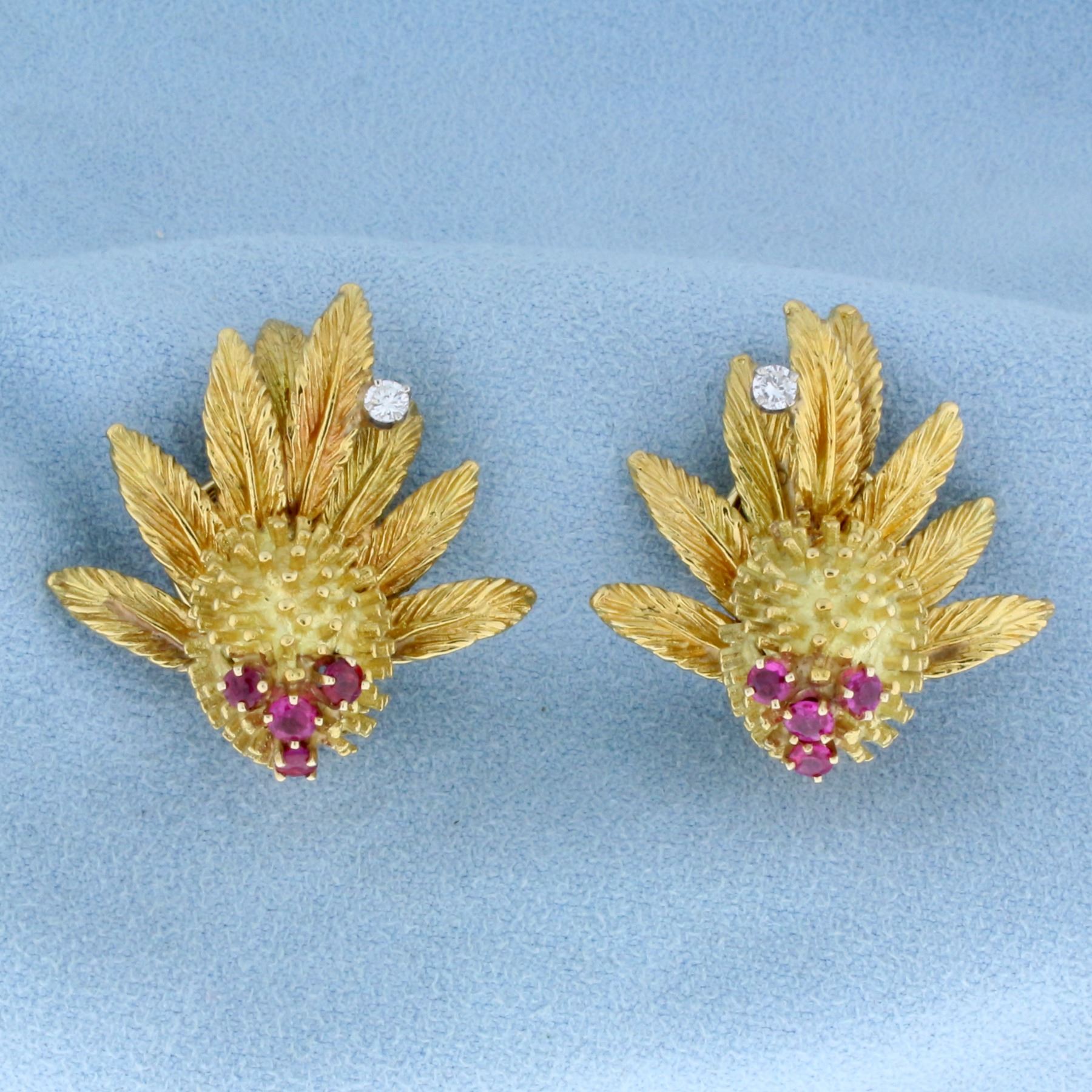 In 18k yellow gold, each earring contains one .06ct very high quality diamond of VS clarity/E color. Each earring also contains four 2.5mm very high quality natural rubies with exceptional color and clarity. 1 1/8 inches long. 19.9g.