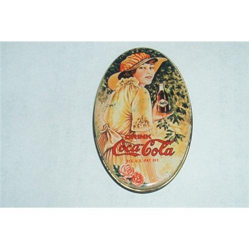Featuring an oval designed, army green, Coco Cola, vintage sewing tin. Displays a beautiful girl holding a bottle of Coco Cola. The lid states: DRINK COCO-COLA. Reg. U.S. Pat. Office. This tin contains spare thread in different colors. (Never Used). Paper Ruler. One Needle Threader is marked Japan and 1 Saftey Pin. Two buttons. The lid displays a ladie's head. This oval shaped tin measures 2 3/4 inches long by 2 inches wide; depth measures 1/2 inch. Gold toned on the inside. Yellow Lid with Yellow dress and hat. Two small roses on the bottom left edge on the lid.