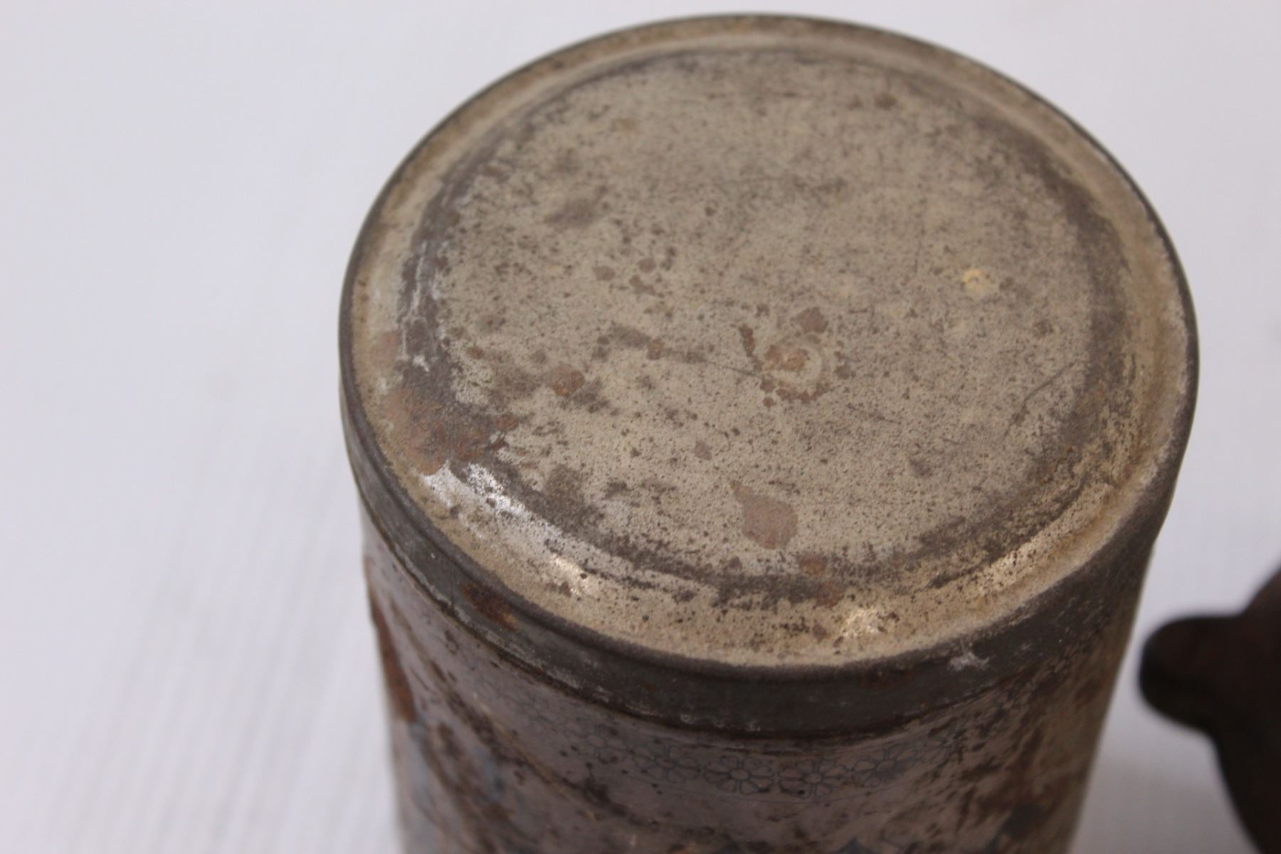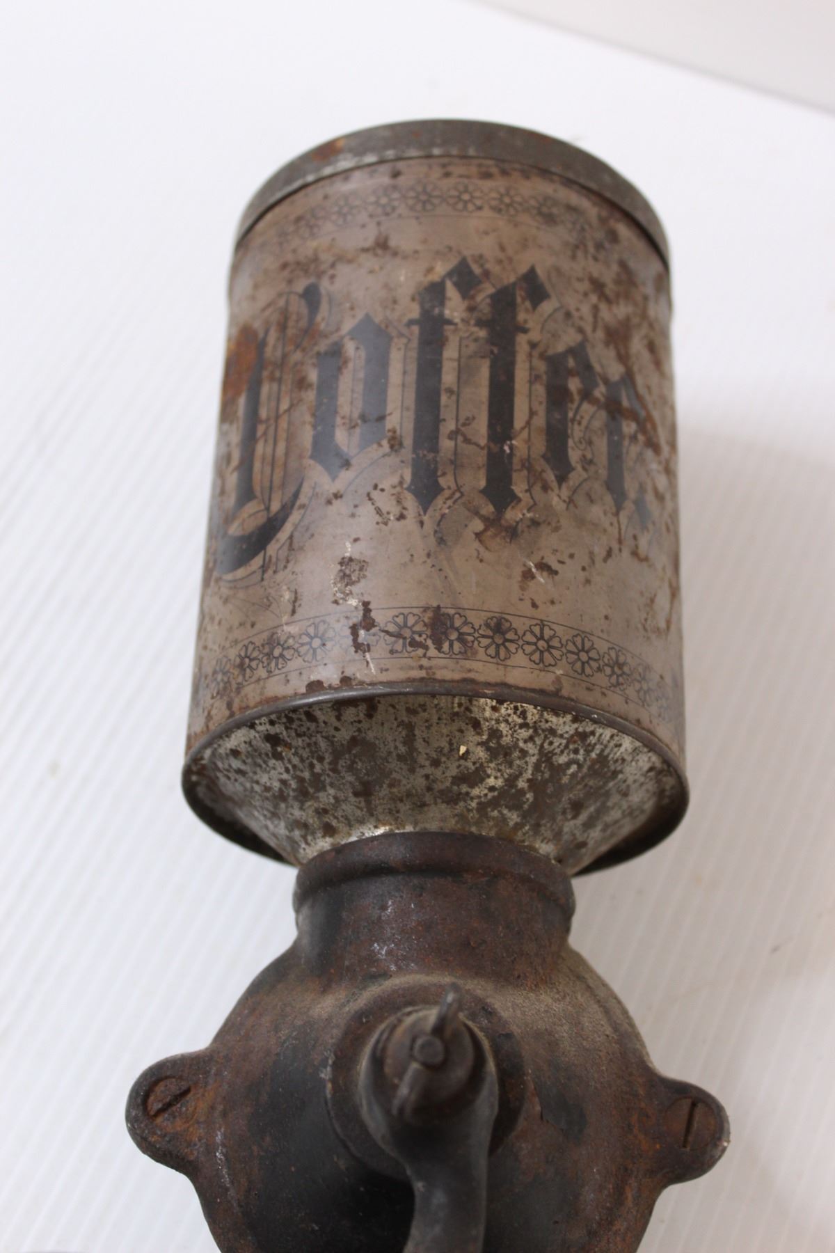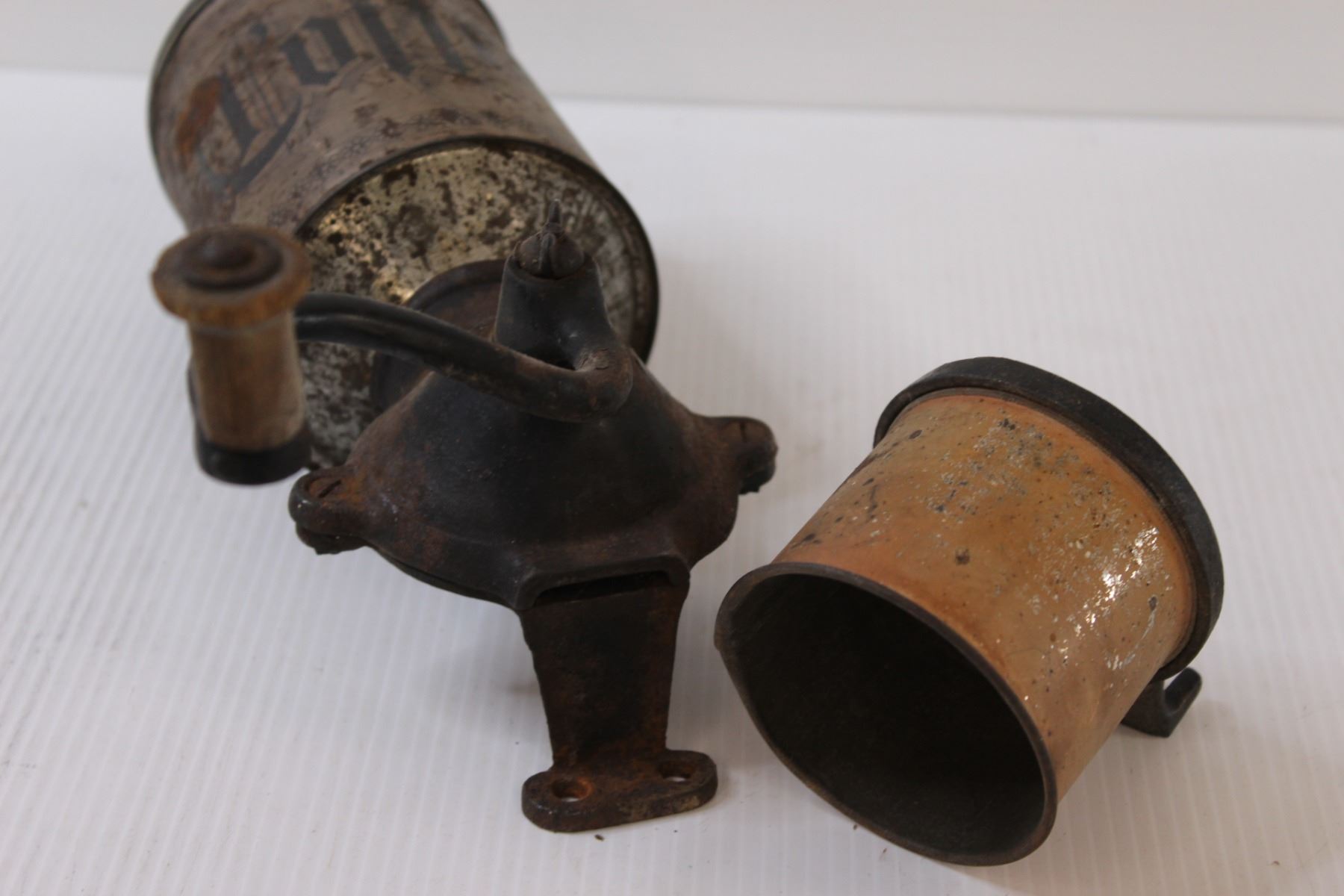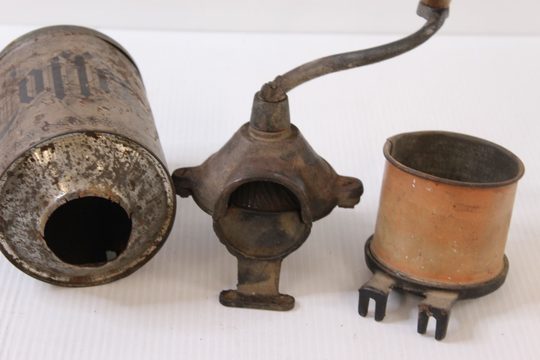 Antique Coffee Grinder Set (Cast Iron & Tin Coffee Bean Holder & Catcher) - 12" x 5"