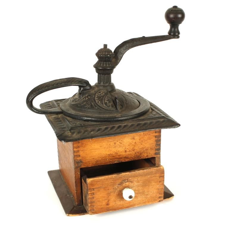 Hand crank coffee grinder circa 1800's. In working condition. Ornately designed top, pull out drawer.