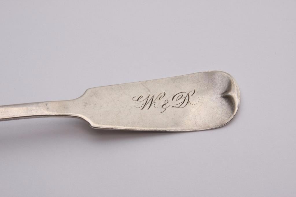 One set of four early coin silver fiddle pattern spoons each with unique monograms. Each spoon measures 5.5 inches.