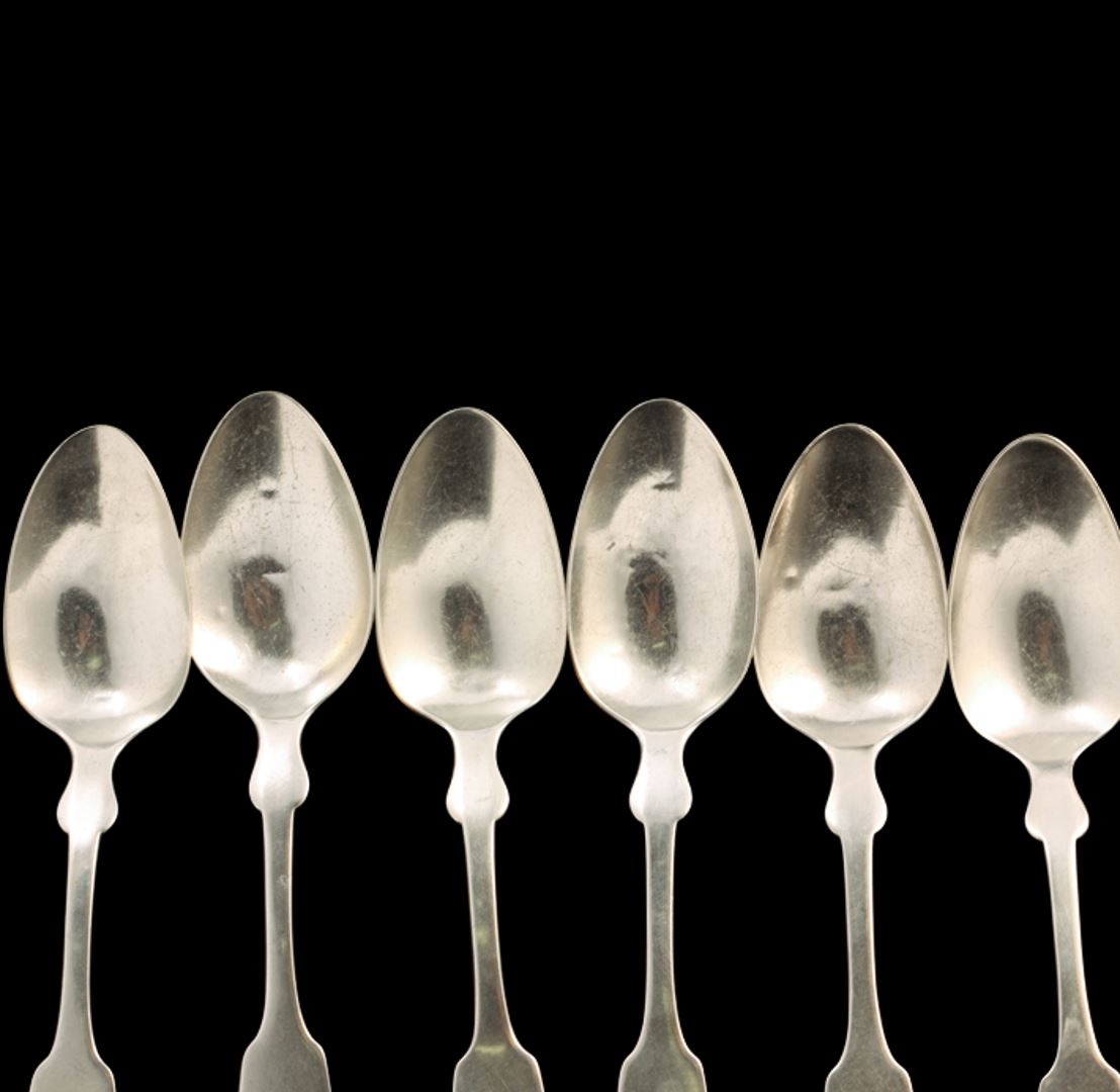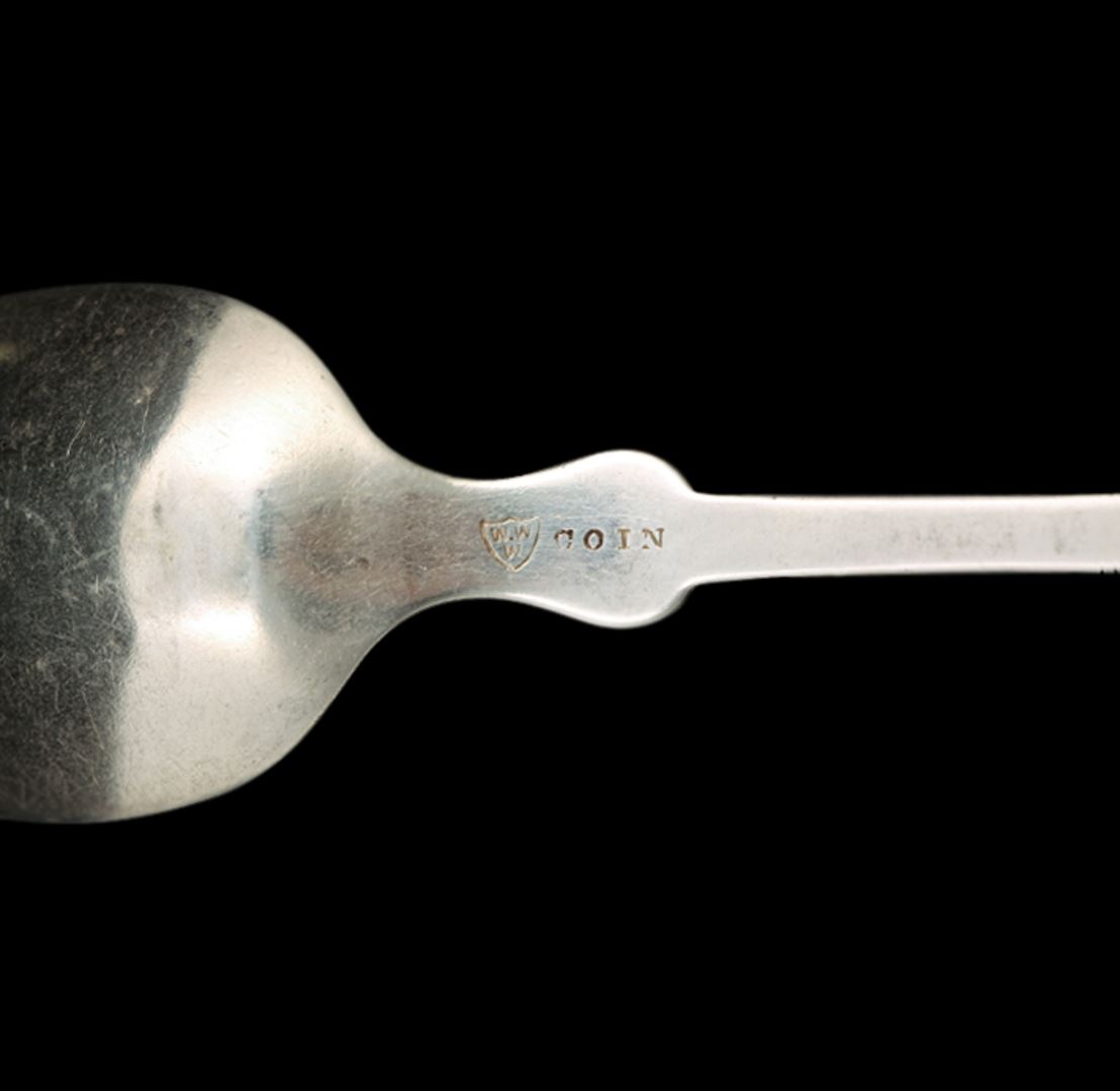 Set of (10) silver spoons crafted by William Wallace Willard of Cazenovia, New York. There is a beautiful period script monogram on the front handle "SWR". It dates from circa 1850 and is in very good condition with typical slight surface scratches and a s amll dings in bowls and on the handles. These pieces measure 6" long.