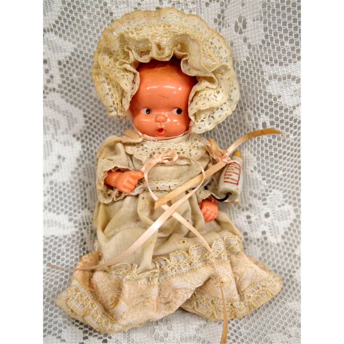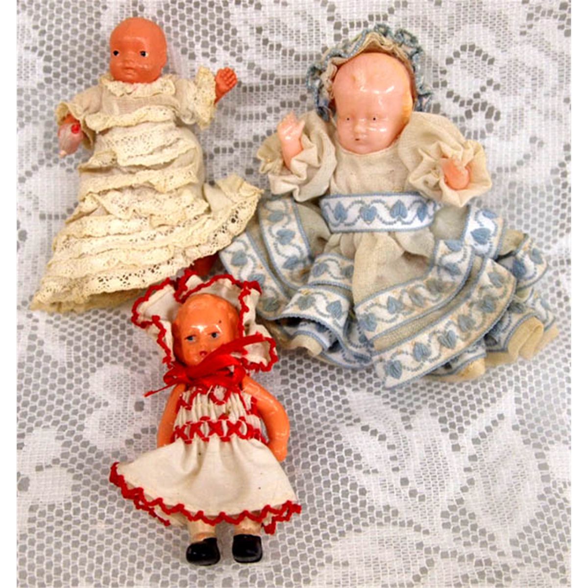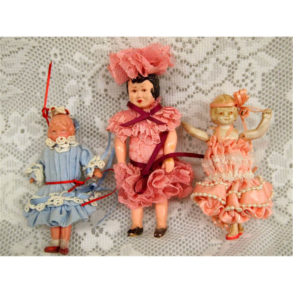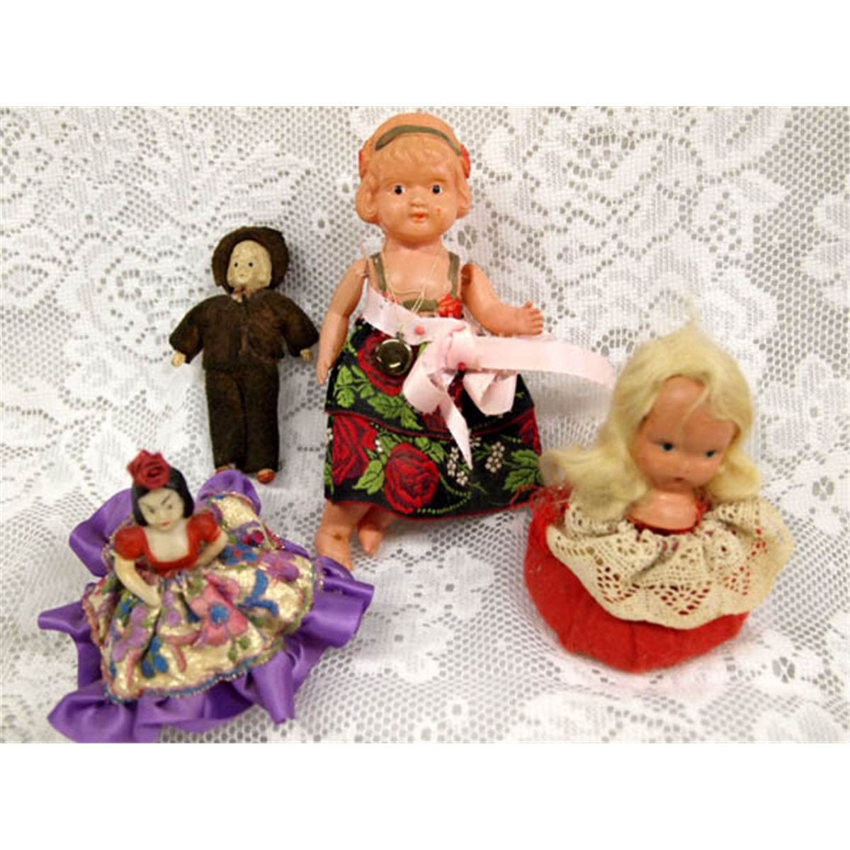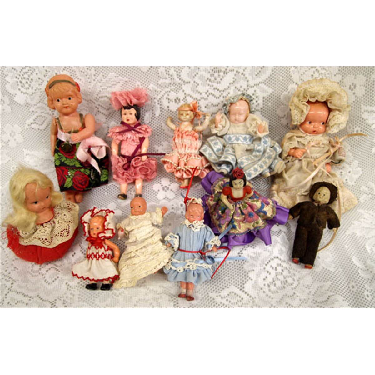 Antique Collection Celluloid Dolls. Eleven dolls in all. One doll has a pin cushion base and a doll head on top. The largest doll is the baby in the white outfit and measures 6.75'' tall from top of head cover to bottom of gown. Some dolls have legs or arms that have come loose (rubber band may be broken). Buyers Pay Actual Shipping and Handling Charges(see terms and conditions for more information).