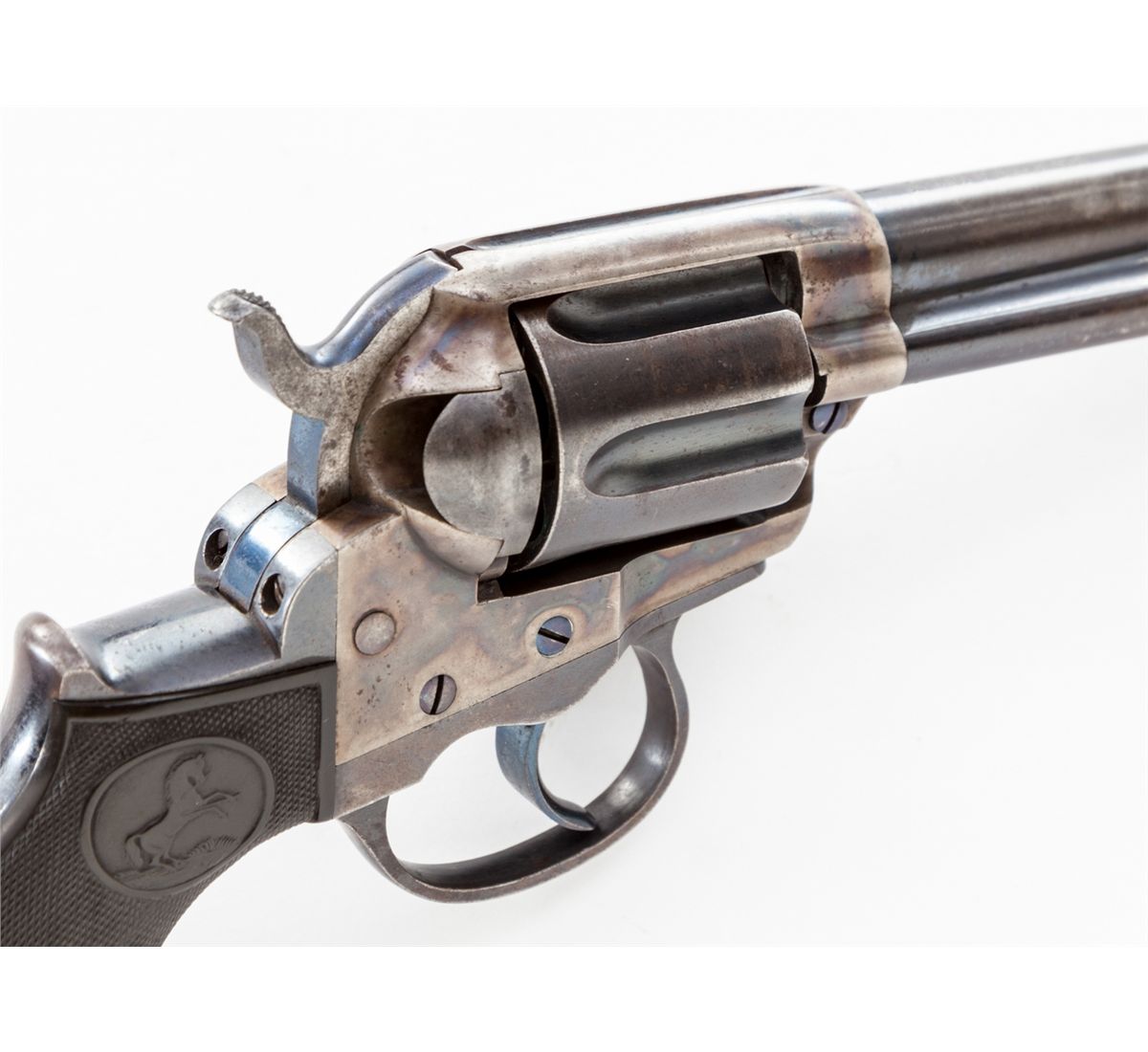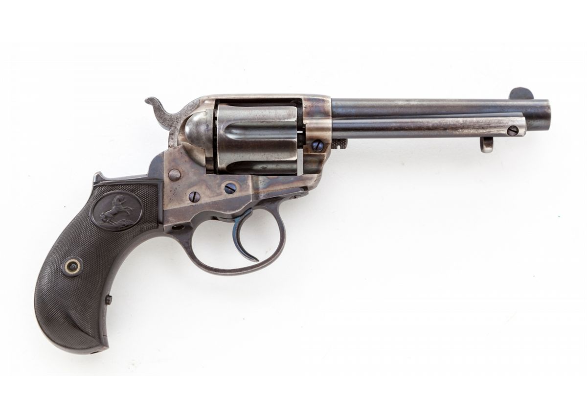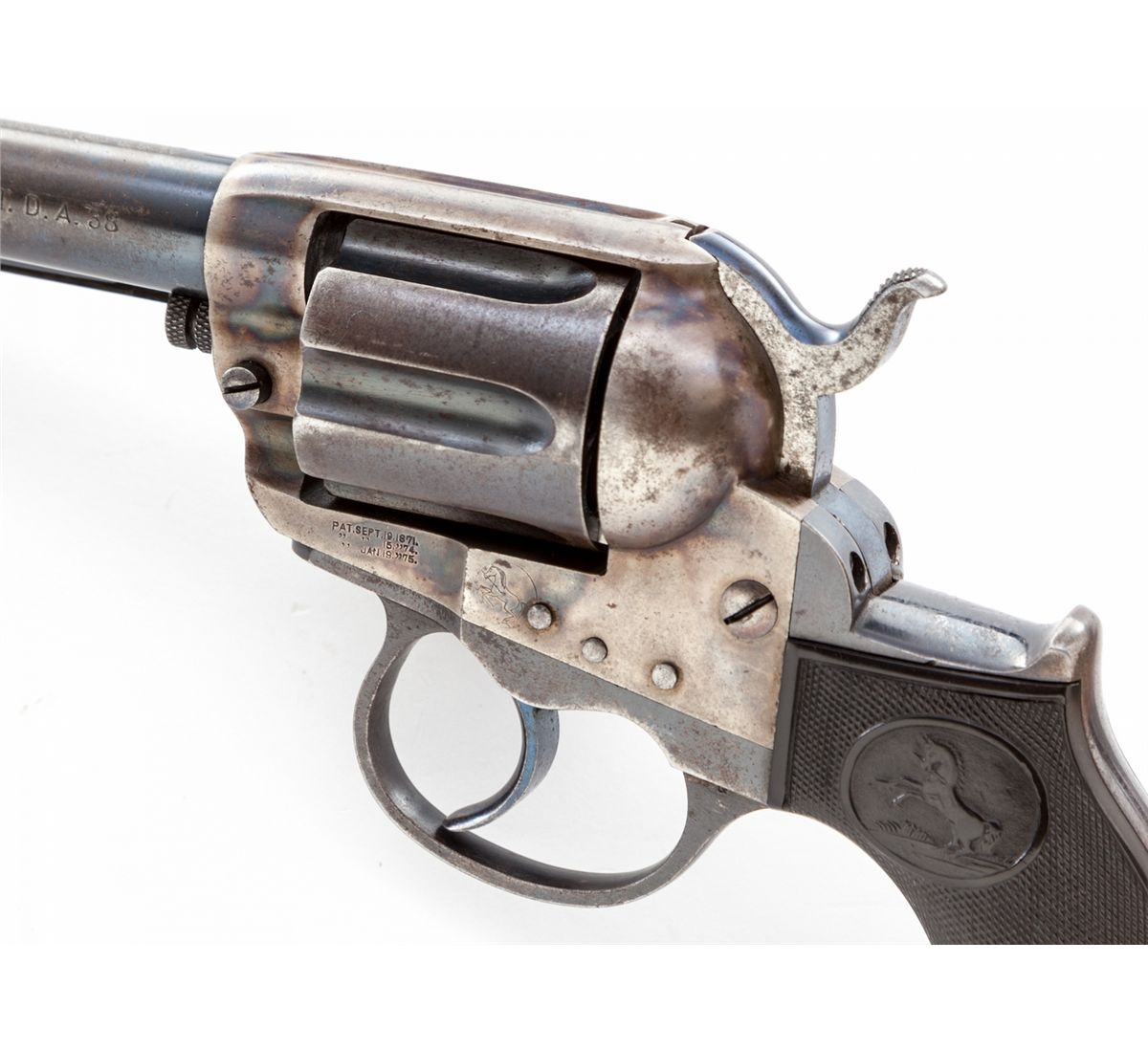 Antique Colt Model 1877 Lightning Double Action Revolver, #80380, .38 Colt cal., 4-1/2'' barrel, blue and case hardened finish, factory checkered hard rubber grips. Mfg'd 1890. Condition is very good to near fine retaining approx. 75% blue with most of the losses to barrel and cylinder. Case hardened frame retains 65%-75% vivid hues with some darkening. Grips and action are crisp, bore is near fine with very light pitting. Est.: $1,000-$1,500. (Antique) (Ernest A. Bryant III estate)