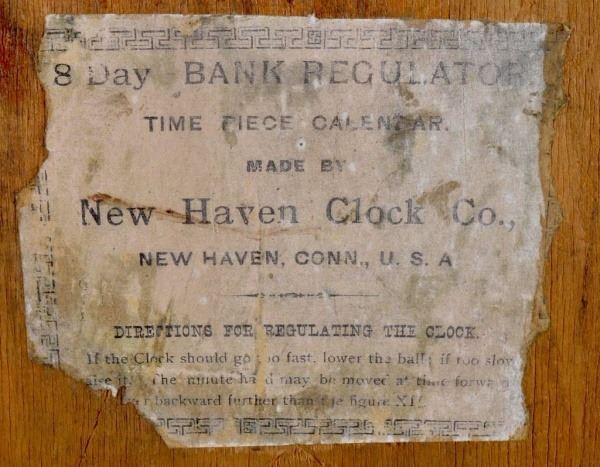 8 Day Bank Regulator. With New Haven Clock Company label. 4" x 18-1/2" x 33-1/2"