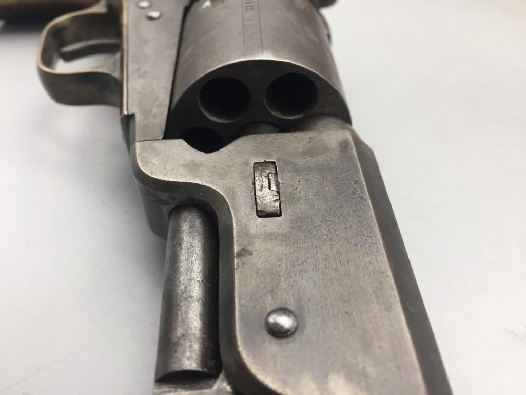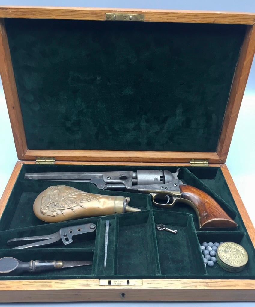 Description: For sale in this lot is an antique Colt Navy, Model 1851 black powder revolver in .36 Caliber with box and accoutrements. It was manufactured in 1853 and comes with a period correct Colt's Patent Bullet Mold and Colt's Patent Flask. The box also appears to be an antique, but we are not sure if it is contemporary to the gun. All serial numbers match. Maker: Colt. Serial No. 31122. Approx Age: Antique Colt Navy, Mfg. 1853. Size: Colt Barrel measures 7-1/2 inches. Flask measures 3" wide x 6-1/2" tall. Bullet mold measures 1-1/8" wide x 4-7/8 tall. Condition: Good for its age. Normal wear and minor imperfections expected on used and vintage items. Please look closely at the pictures as they are an important part of our description. Shipping: There will be a $15 handling / packaging fee for shipping this lot. The actual cost of postage will be added on top of that. BUY IT NOW: If you would like to buy this item now without waiting for the auction to end (this option is only available up to 48 hours before the auction starts to close), the “Buy it Now” price is the high estimate of this lot. If you would like to end the auction early and pay the high estimate (plus applicable fees), please contact us by phone or email and reference this lot number. *****ANTIQUE - This firearm DOES NOT REQUIRE an FFL Transfer*****