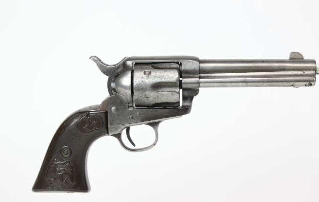 Antique Colt SA .41 cal. SN 14XXXX revolverwith 4 3/4 barrel, two line address and hard rubber eagle grips. Revolver remains in good condition, serial numbers matching, 85% silver gray finish, plum brown in protected areas. Grips good showing wear and flattening consistent with overall condition of gun, "H" carved on bottom of left and right sides with excellent fit, NO repairs, chips or loss. Metal surfaces show some light to moderate pin prick pitting scatteredthroughout, front sight slightly filed down. Very good mechanically with nice action the bore good to very good. Made in 1891, Antique. Est. 2400-3200