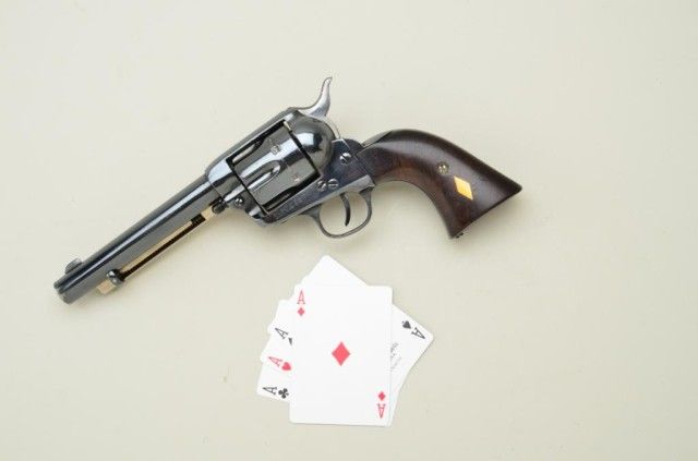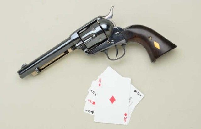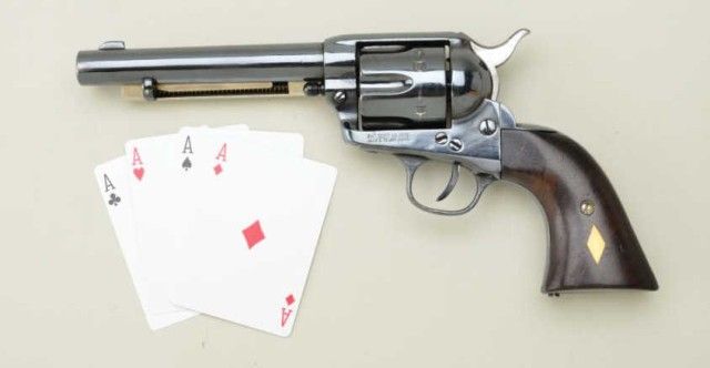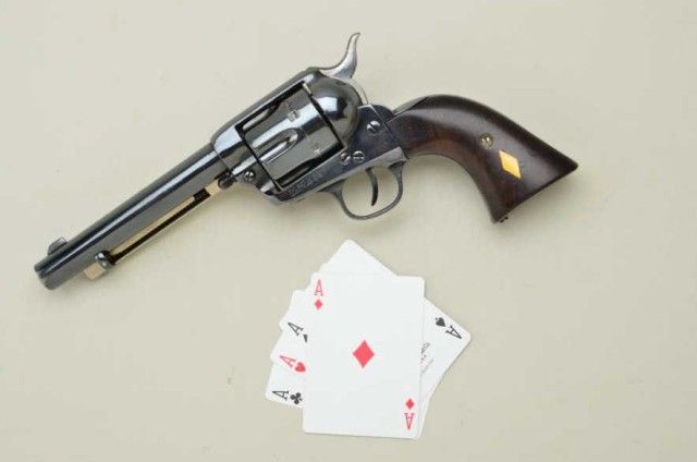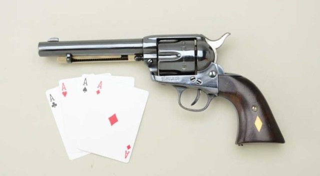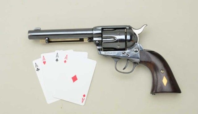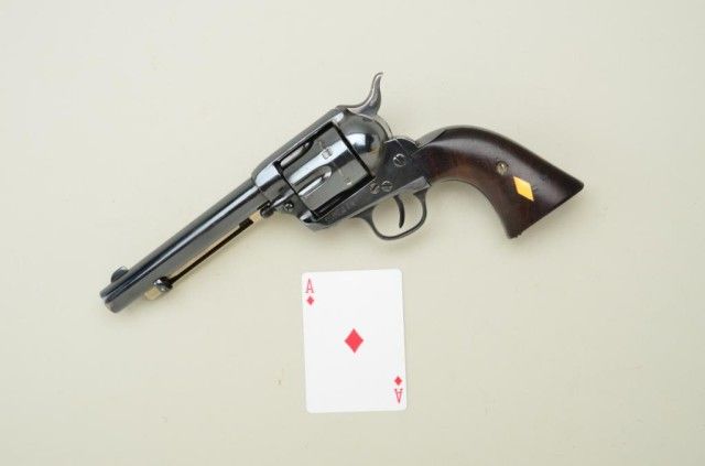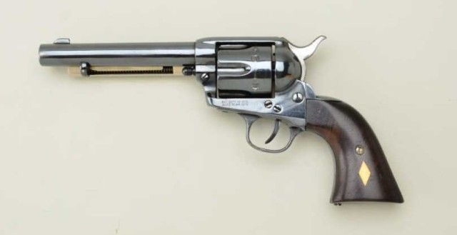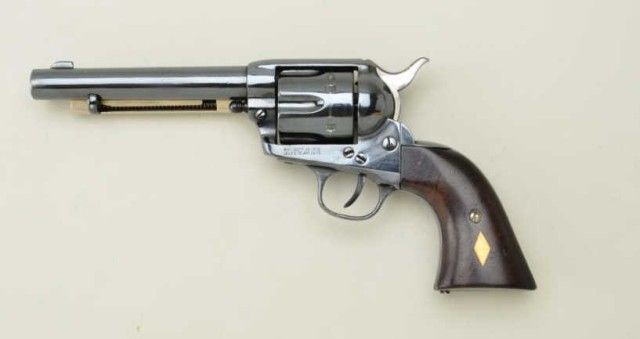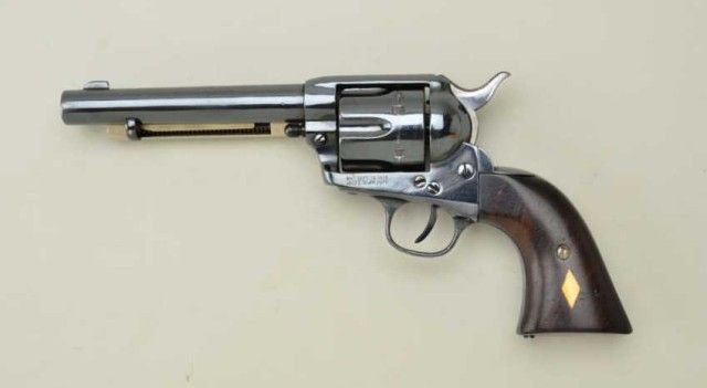 Antique Colt SAA revolver, .32 WCF cal., barrel reduced to 5-1/2”, old reblued finish with nickel plated ejector rod housing, custom wood grips with diamond bone inlay on each side, #169015. This gun is in overallgood condition as modified and refinished some time ago; fair bore, action is working but does not stay on full cock; custom wood grips are very good; all matching visible serial numbers. Est.: $1,000-$1,500.