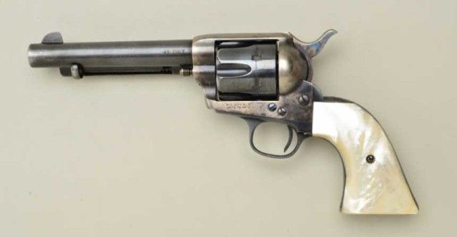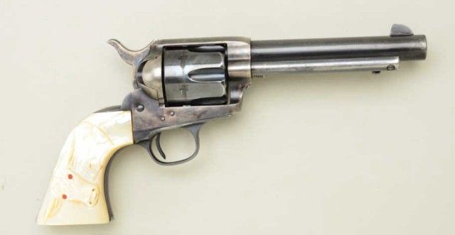Antique Colt SAA revolver, .45 cal., 5-1/2” barrel, old restored blue and case hardened finish, raised carved steer head pearl grips with red inset eyes, #162946. This gun is in overall very good condition as restoredshowing considerable blue and case colors, crisp action and markings, very good bore, beautiful iridescent pearl grips in overall very good condition; slightly oversized for this gun but definitely old and made for aSAA. Est.: $2,000-$3,000.