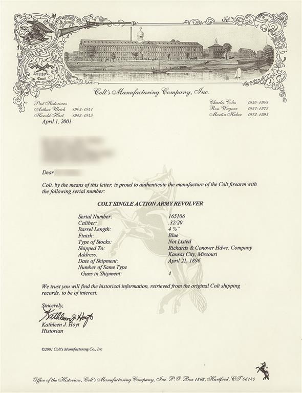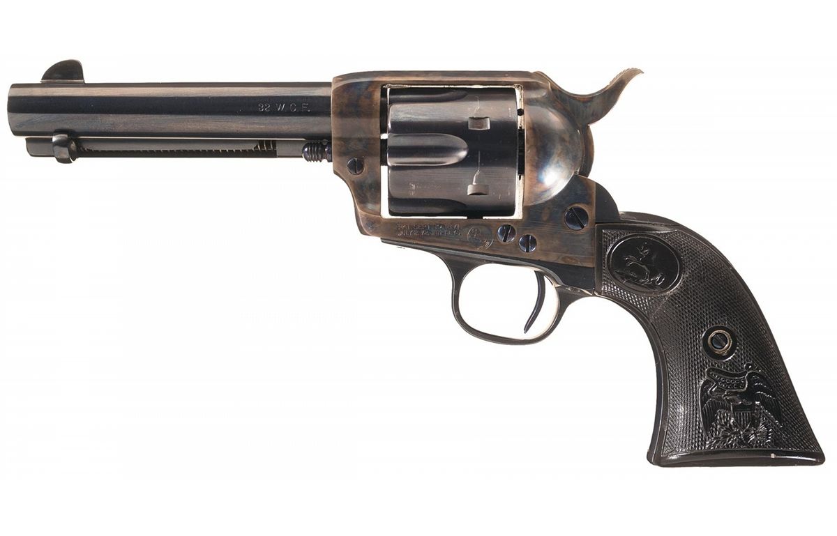 According to the included factory letter this revolver was part of a four-weapon shipment to the Richards & Conover Hardware Company of Kansas City, Missouri on April 21, 1896, in 32/20 caliber with a 4 3/4 inch barrel, blue finish, and "Not Listed" grips. Also included is a notarized letter, dated May of 1998, Pima County, Arizona and signed by Lieutenant Colonel John W. Wallace, U.S.A.F. (Ret.), which outlines a chain of possession starting with Robert Leroy Parker (named "Leroy Parker" in the affidavit), aka Butch Cassidy, leader of the Wild Bunch, who gave the revolver to small time outlaw and Cassidy Gang member Joe Davenport. Retiring from a life of crime and taking a job as a night watchman in Rock Springs, Wyoming, Davenport later gave the revolver to a dentist named Dr. Breihan, possibly as payment for services rendered. The revolver remained with the Breihans until the Dr's son, also a Doctor, traded it to Colonel Wallace's father Jack Wallace in exchange for his services as a machinist. Note: The notarized letter states that the revolver was given to Joe Davenport by Cassidy when Cassidy went to prison for cattle rustling. Cassidy went to prison in 1894, two years before the revolver was shipped from the Colt factory. Fixed sights, with the two line Hartford address on top of the barrel, "32 WCF" on the left side and the left side of the frame is marked with the two line, three patent dates followed by the circled Rampant Colt. The matching serial number is marked on the bottom of the frame, trigger guard and back strap. With earlier production replacement checkered hard rubber grips, bearing the Rampant Colt and American Eagle imprints.