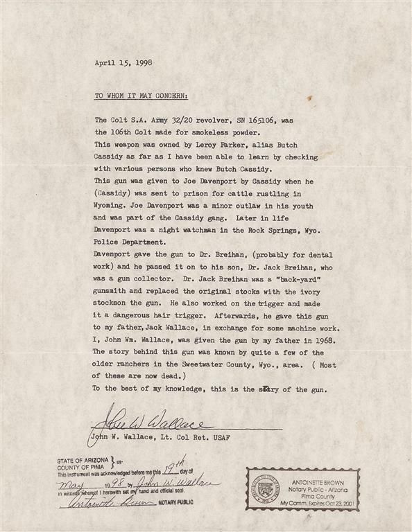 Antique Colt Single Action Army Revolver with Notarized Letter Attributing the Revolver to Famous Western Outlaw Robert Leroy Parker, Best Known as Butch Cassidy
