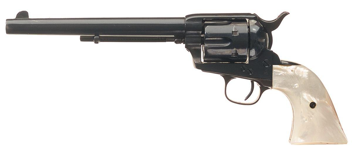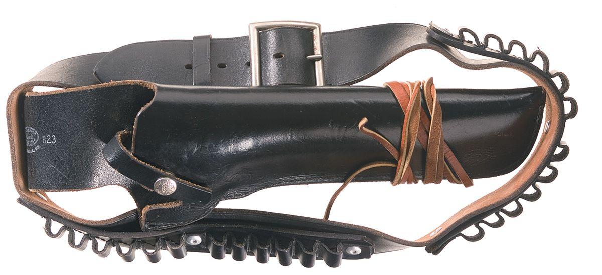 Manufactured in 1885. Numbers "116553" are stamped on the frame, trigger guard and back strap with "53" on the rear face of the cylinder, "1130" assembly number on the loading gate. Complete with ill-fitting smooth pearl grips and a black leather holster and belt rig with 24 cartridge loops.