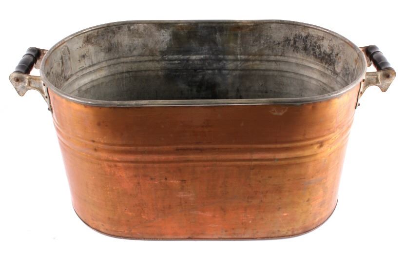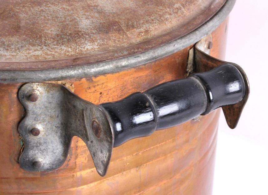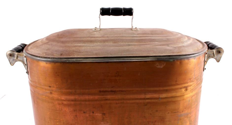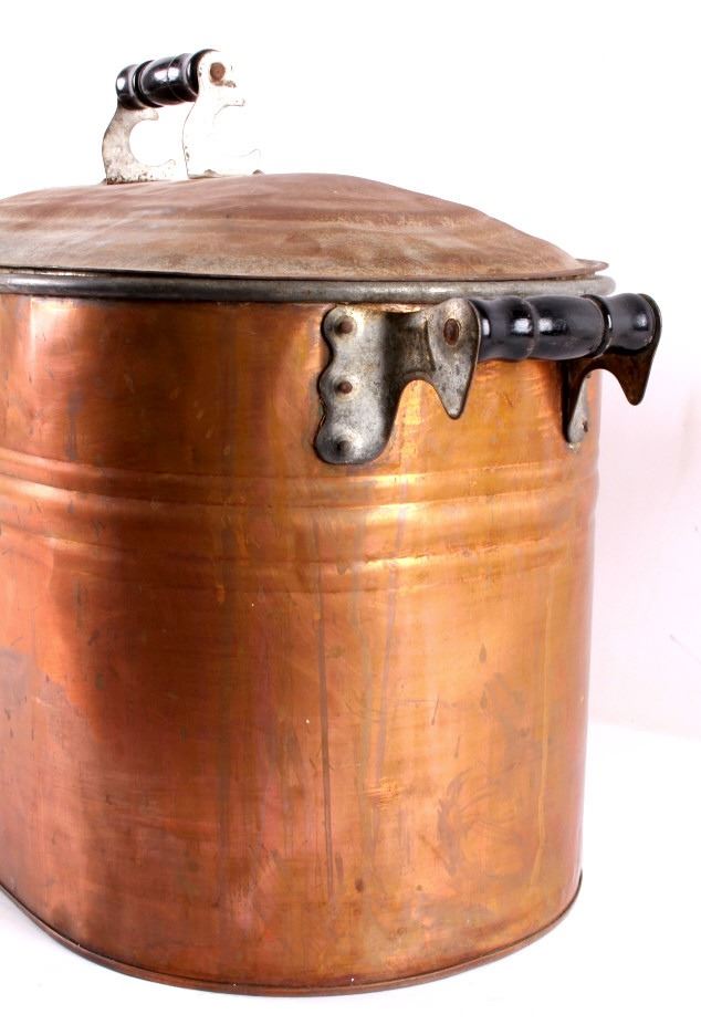 This is an antique copper boiler with the original lid. The boiler is made from copper and features wooden handles. The boiler comes with the original tin lid. The antique copper boiler is in good condition. It measures 12.25" x 28" and is 18" tall with lid.