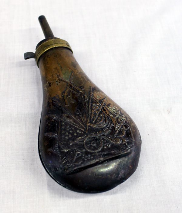 Antique Copper & Brass Powder Horn, measures 8''L, seams are separating, depicts Civil War scene on front