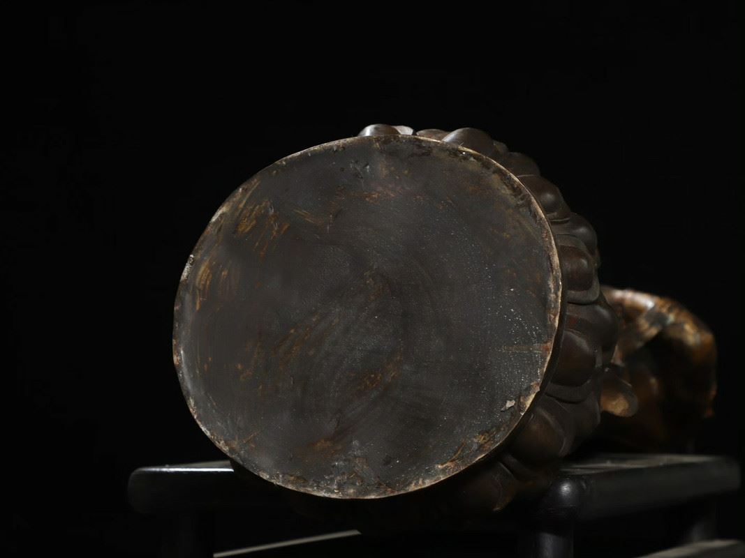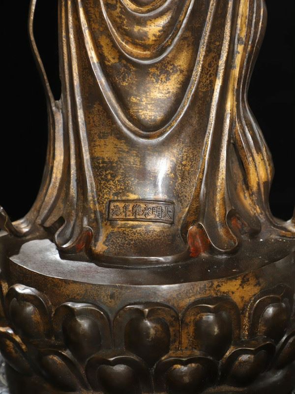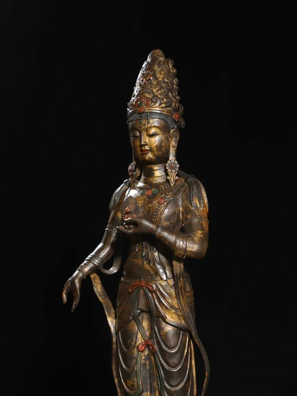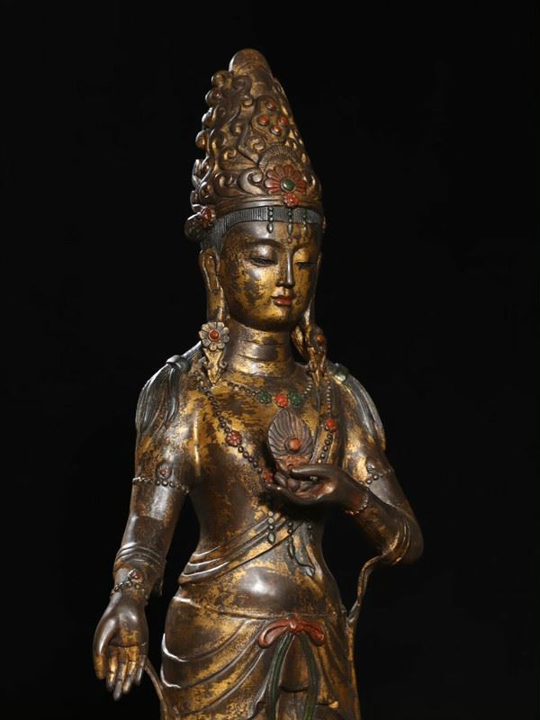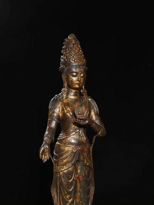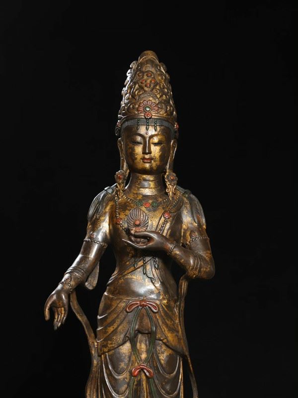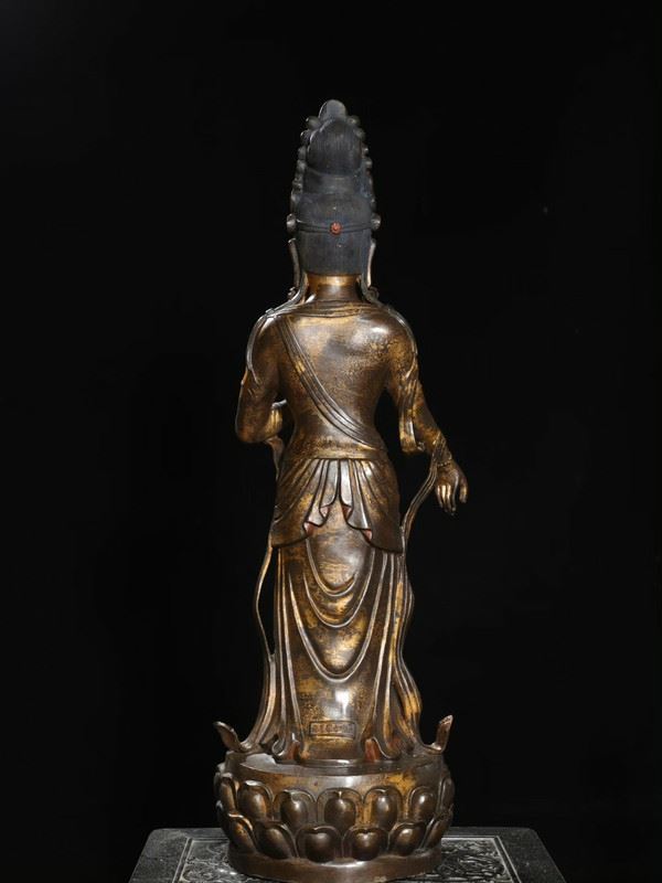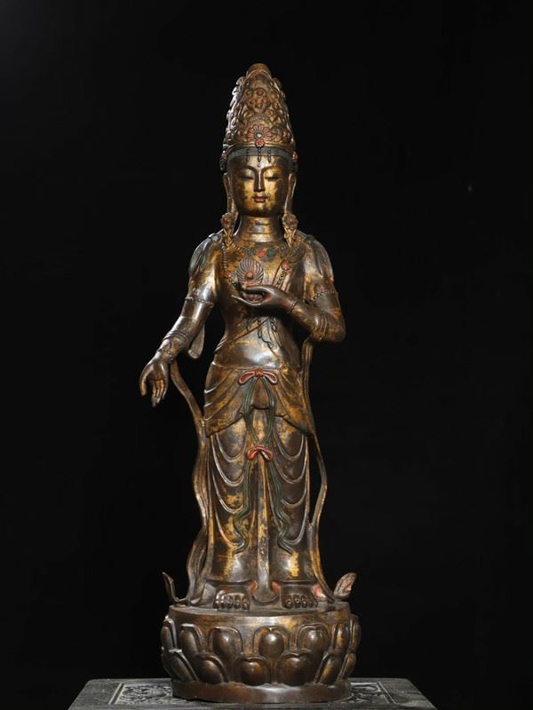 This stunning antique statue represents Avalokiteshvara, the Bodhisattva of Compassion, elegantly captured in a standing posture. The intricate details of the figure, from the serene expression to the flowing robes, are enhanced by the rich copper-gilt finish, showcasing the sophistication of traditional Buddhist artistry. The Bodhisattva holds a lotus in one hand, symbolizing purity and enlightenment, while the other hand is raised in a gesture of blessing. The lotus pedestal and subtle design reflect the divine grace and compassionate nature of Avalokiteshvara.