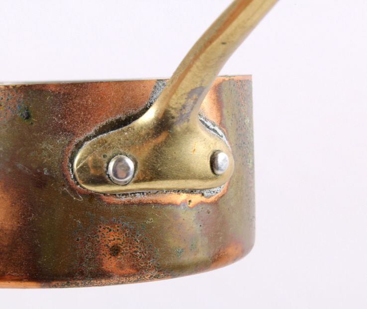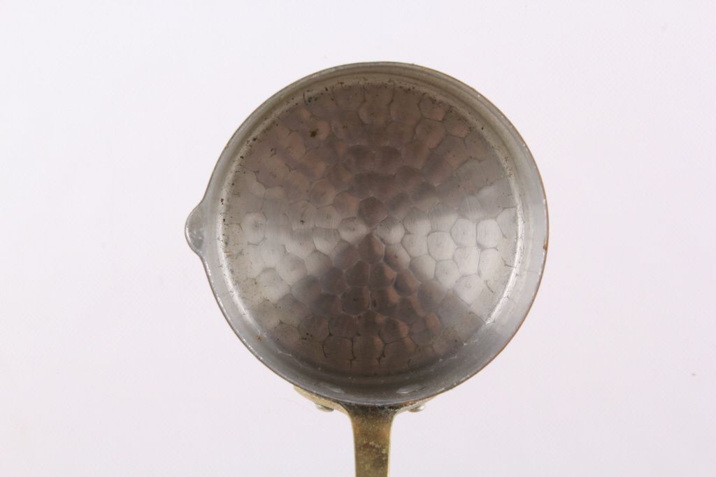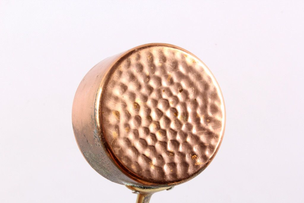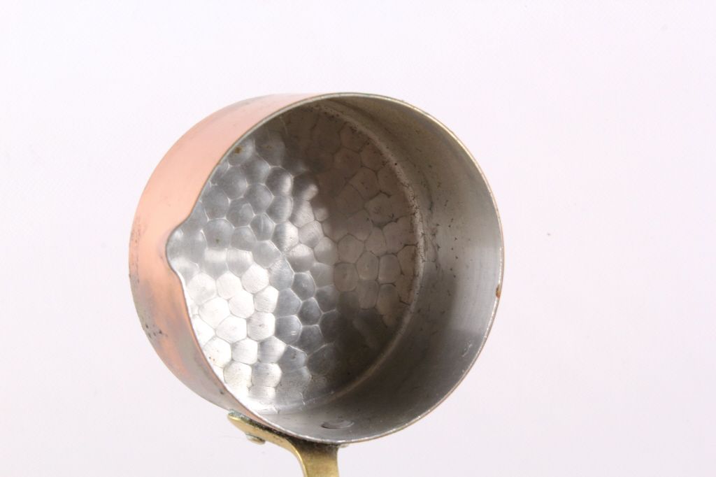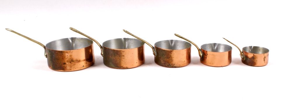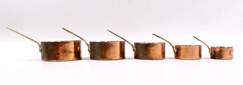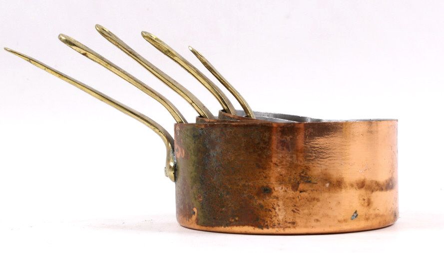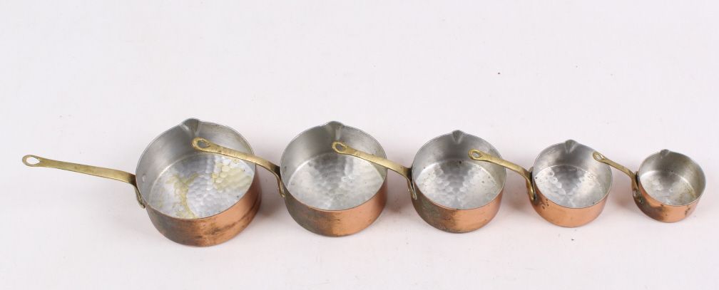 Five antique copper measuring cups (complete set) featuring hammered bottoms. Handles include holes for easy hanging for display or use. Largest piece measures 11/2 inches tall by 3 1/2 inches in diameter.