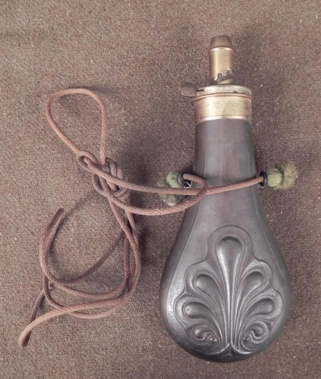 This is an antique copper powder flask, most likely used by the U.S. military or a military group. It probably dates from the late 1800's. Both sides have a fancy raised plume design. No maker name or markings are present. There are two ringlets for carrying, on which is tied some very old string with soft tassle ends. The dimensions are 8 x 3 1/4 inches. Its condition is very good for its age, with only a few minor dings, and light surface wear. The thumb lever seems to operate fine. * This is a splendid flask for the true collector.
