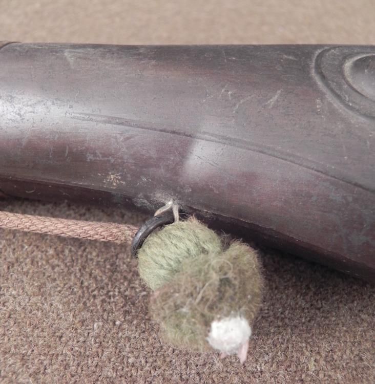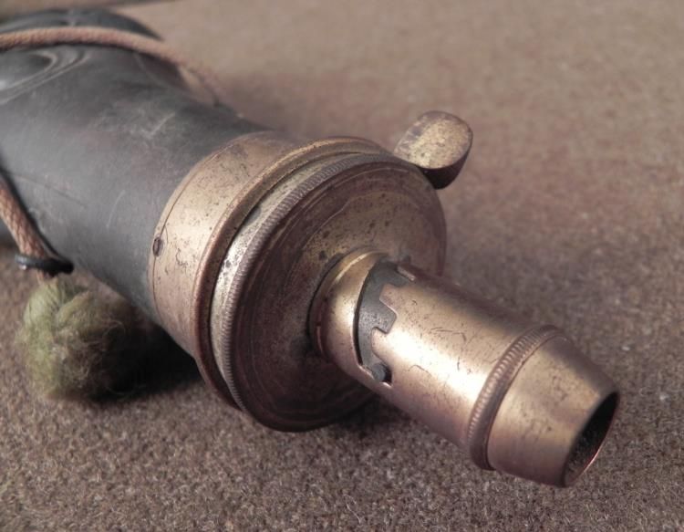 This is an antique copper powder flask, most likely used by the U.S. military or a military group. It probably dates from the late 1800's. Both sides have a fancy raised plume design. No maker name or markings are present. There are two ringlets for carrying, on which is tied some very old string with soft tassle ends. The dimensions are 8 x 3 1/4 inches. Its condition is very good for its age, with only a few minor dings, and light surface wear. The thumb lever seems to operate fine. * This is a splendid flask for the true collector.