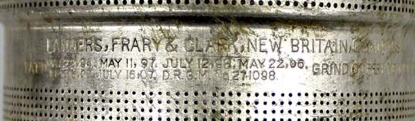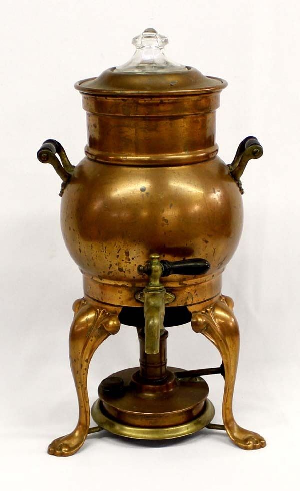 Antique Copper Coffee Urn, Samovar Percolator w/ Spirit Lamp Burner, early 1900s, marked on the bottom of the burner ''Patented March 20, 1906 July 17, 1906'', measures 14'' x 7'' x 7.5'', wood and brass handles, inner coffee basket is marked ''Landers, Frary, & Clark, New Britain, Conn U.S.A.'' then it lists several patent dates with the earliest May 22, 1894 and the latest July 16, 1907 ''D.R.G.M. No. 271098 Grind Coffee Medium Fine''