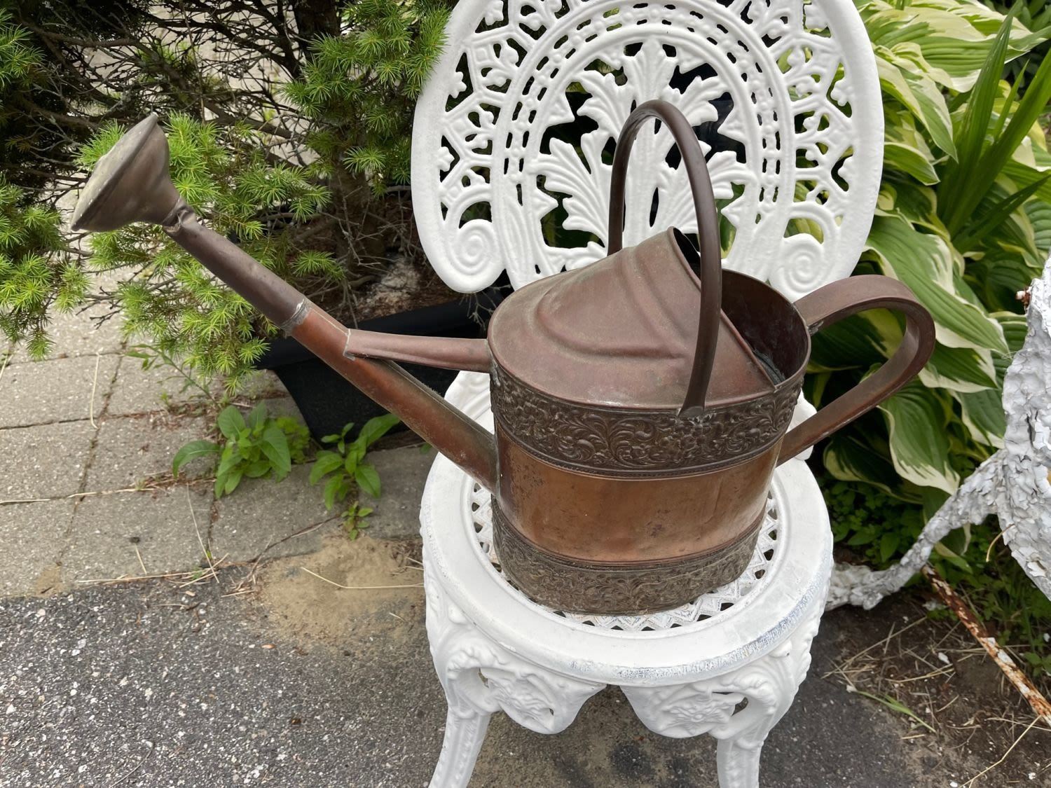 Beautiful Antique Copper Watering Can w scroll work on both the top and lower section of the can.