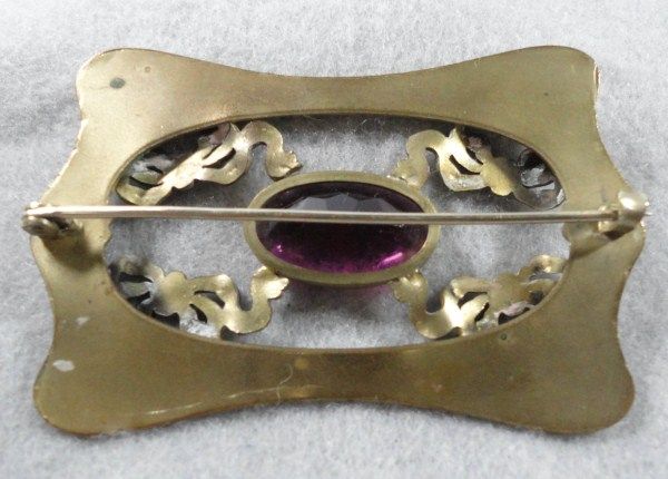Excellent Condition! Purple oval faceted glass stone in center. 3" x 2". Great vintage/antique jewelry item!