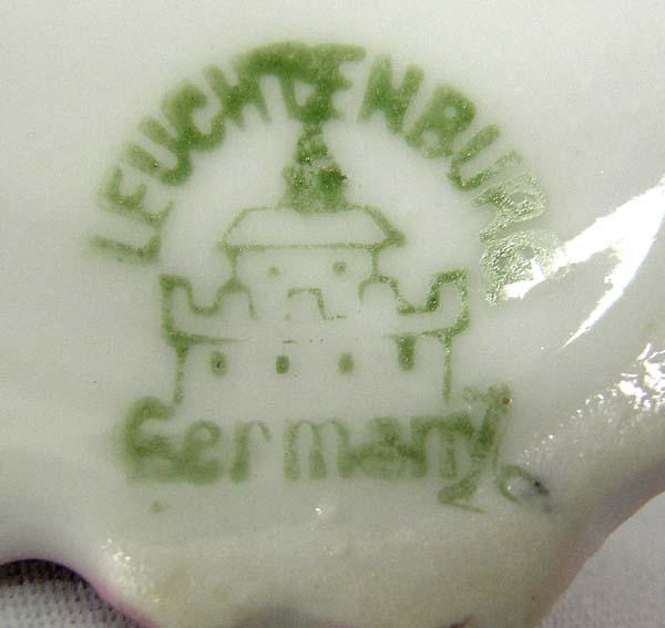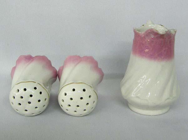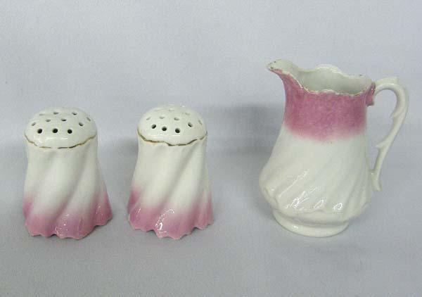Antique Cream Pitcher and Salt and Pepper Shakers, salt and pepper shakers marked Leuchtenburg, Germany and missing rubber stoppers on bottoms, pitcher measures approx. 3.75'' x 3''. SHI $25.