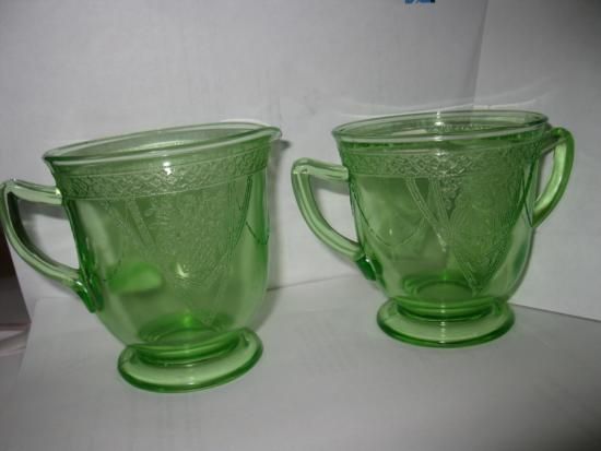 Beautiful green Depression glass Sugar and CreamerApproximately 4 inches highFederal depression glass. Love Bird design on sides of both pieces
