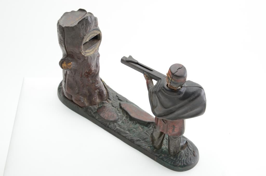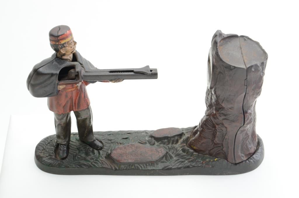 Antique Creedmore mechanical cast iron bank by J & E Stevens in working condition at time of description with the majority of its original paint and a lovely aged patina. Est.: $1,000-$2,000.