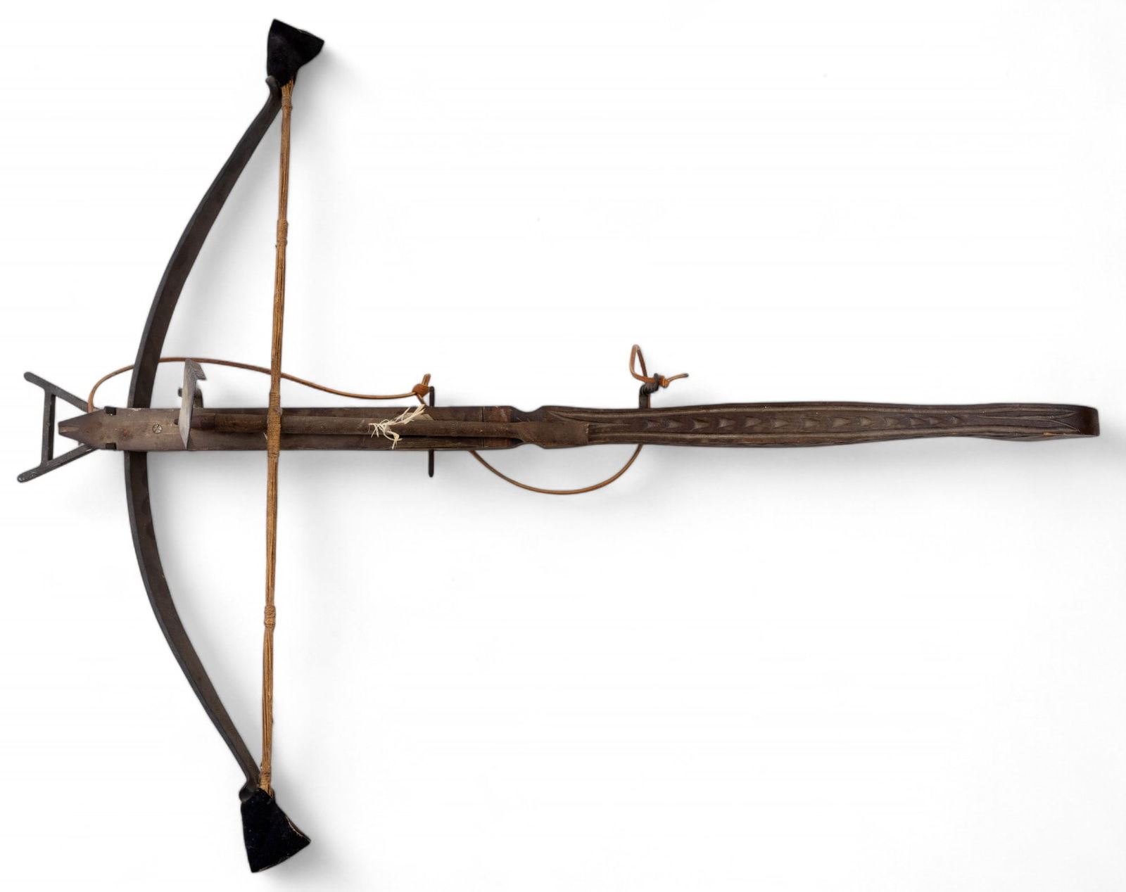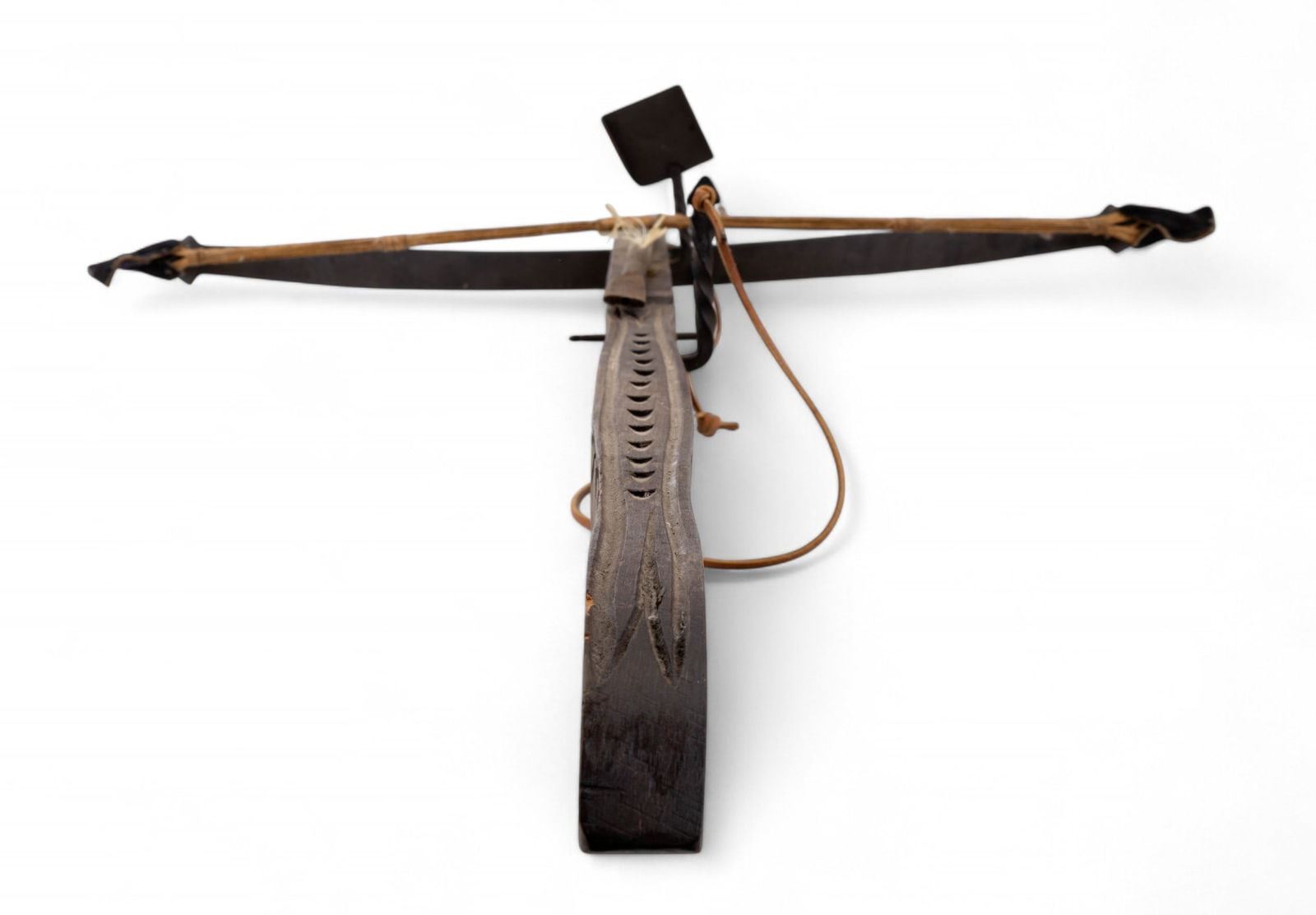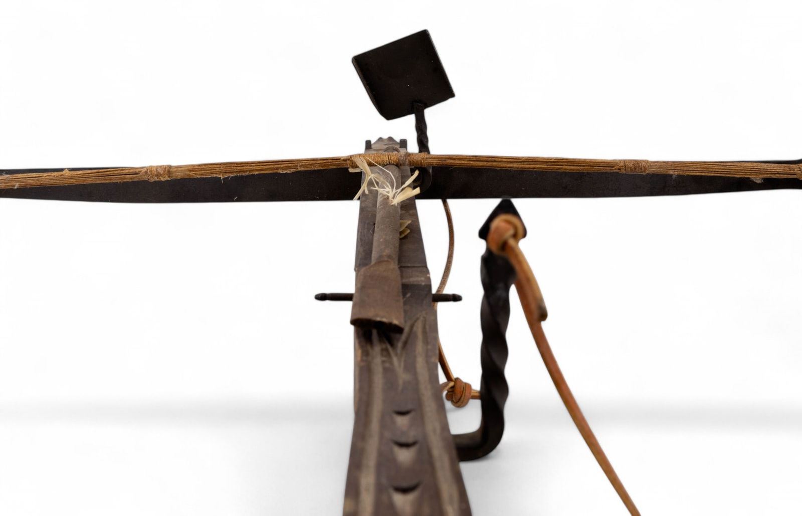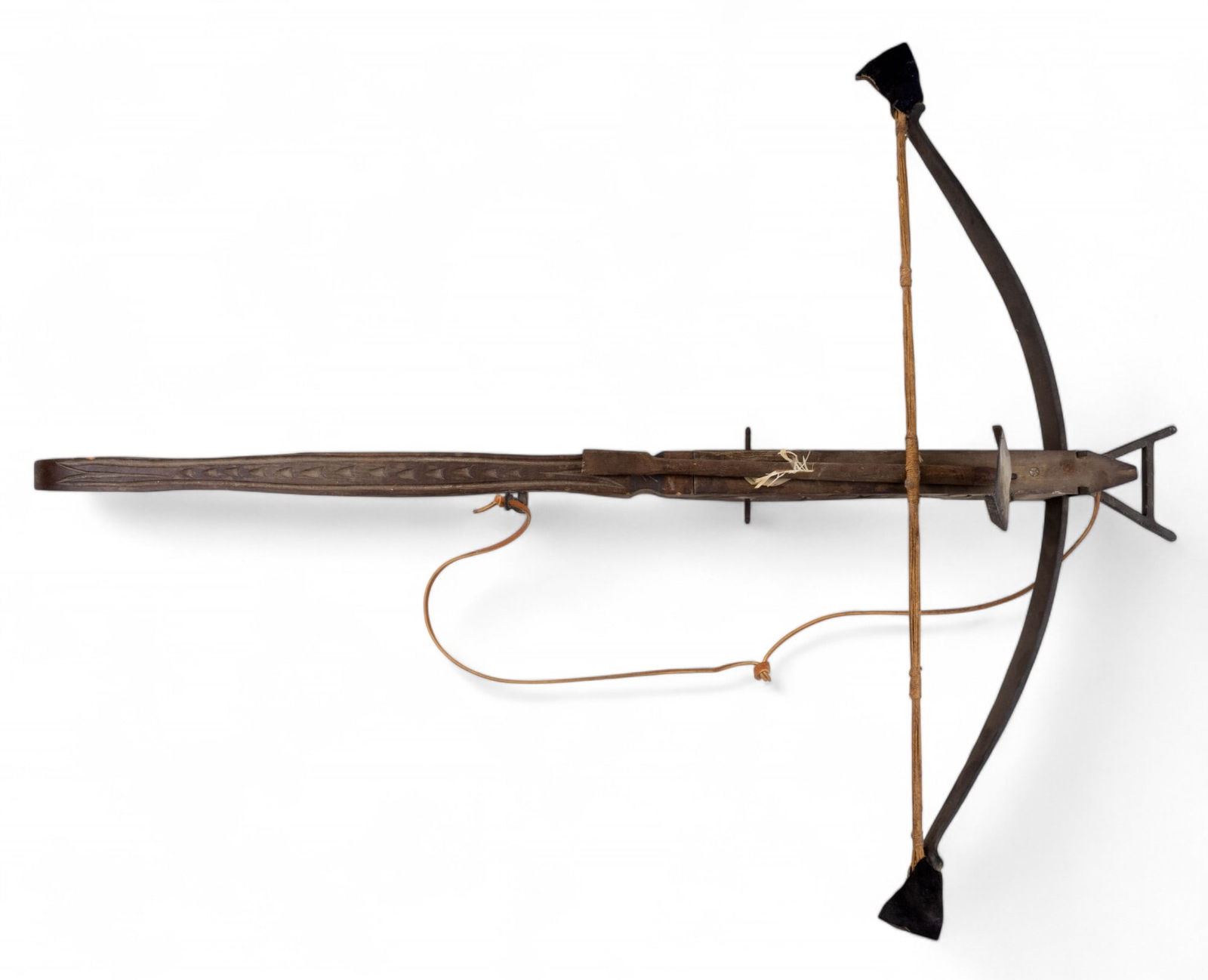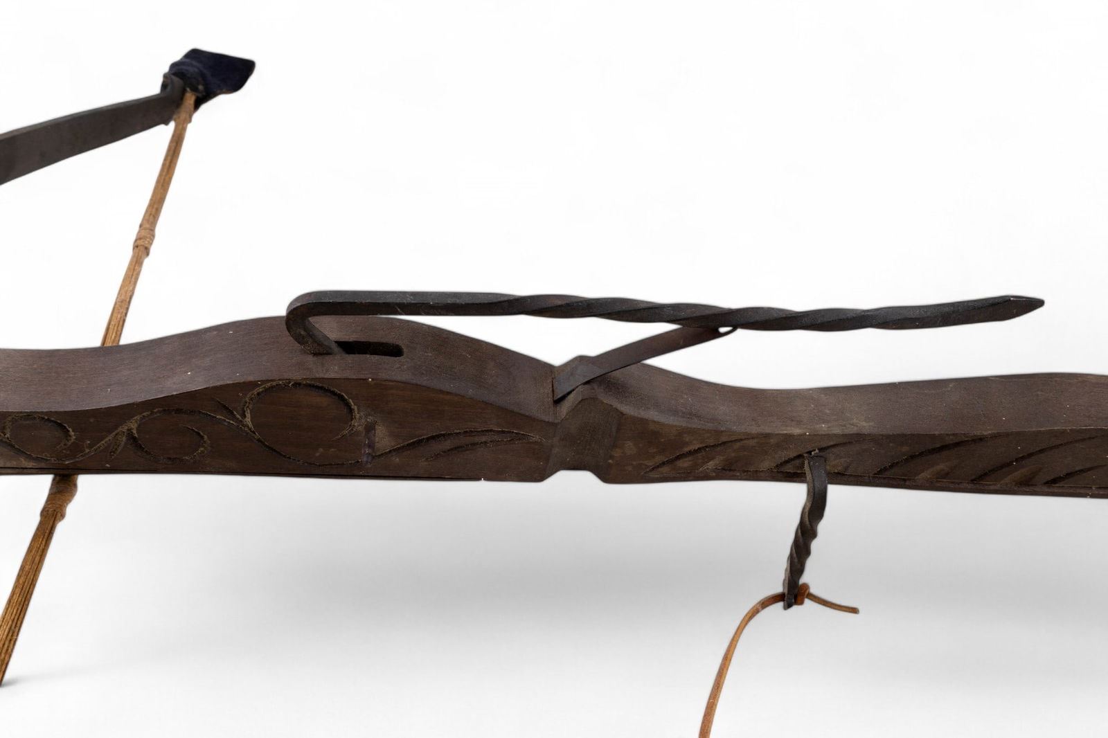 Continental antique crossbow, passably functional w/ early bolt. Item measures approx. 31.5" long & 24" wide.