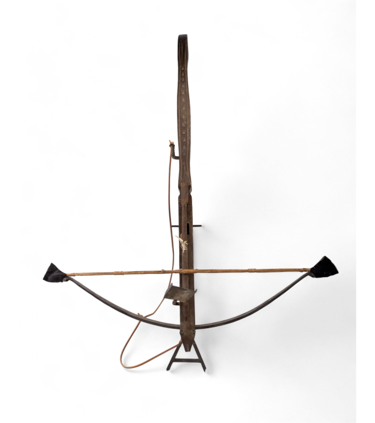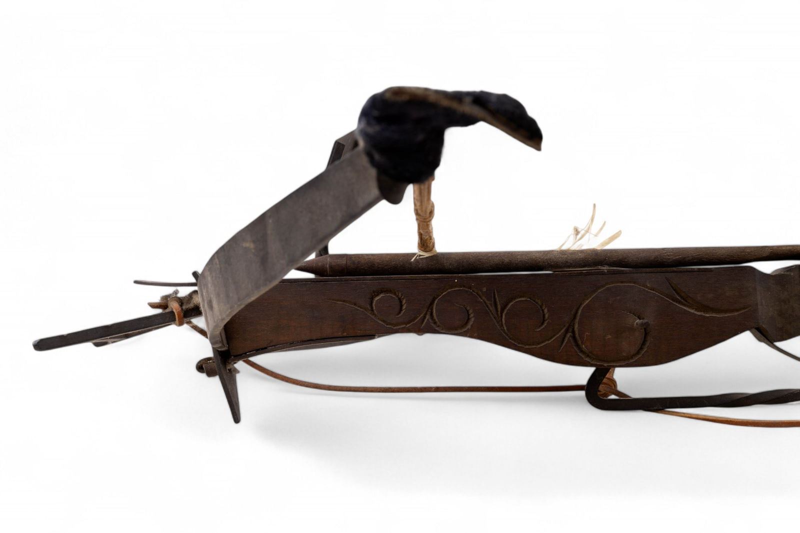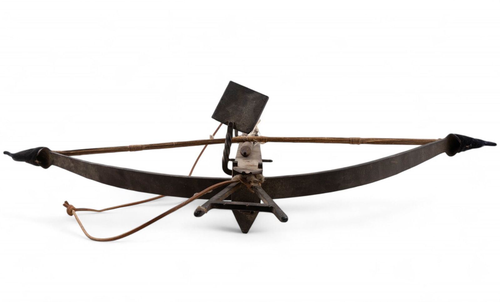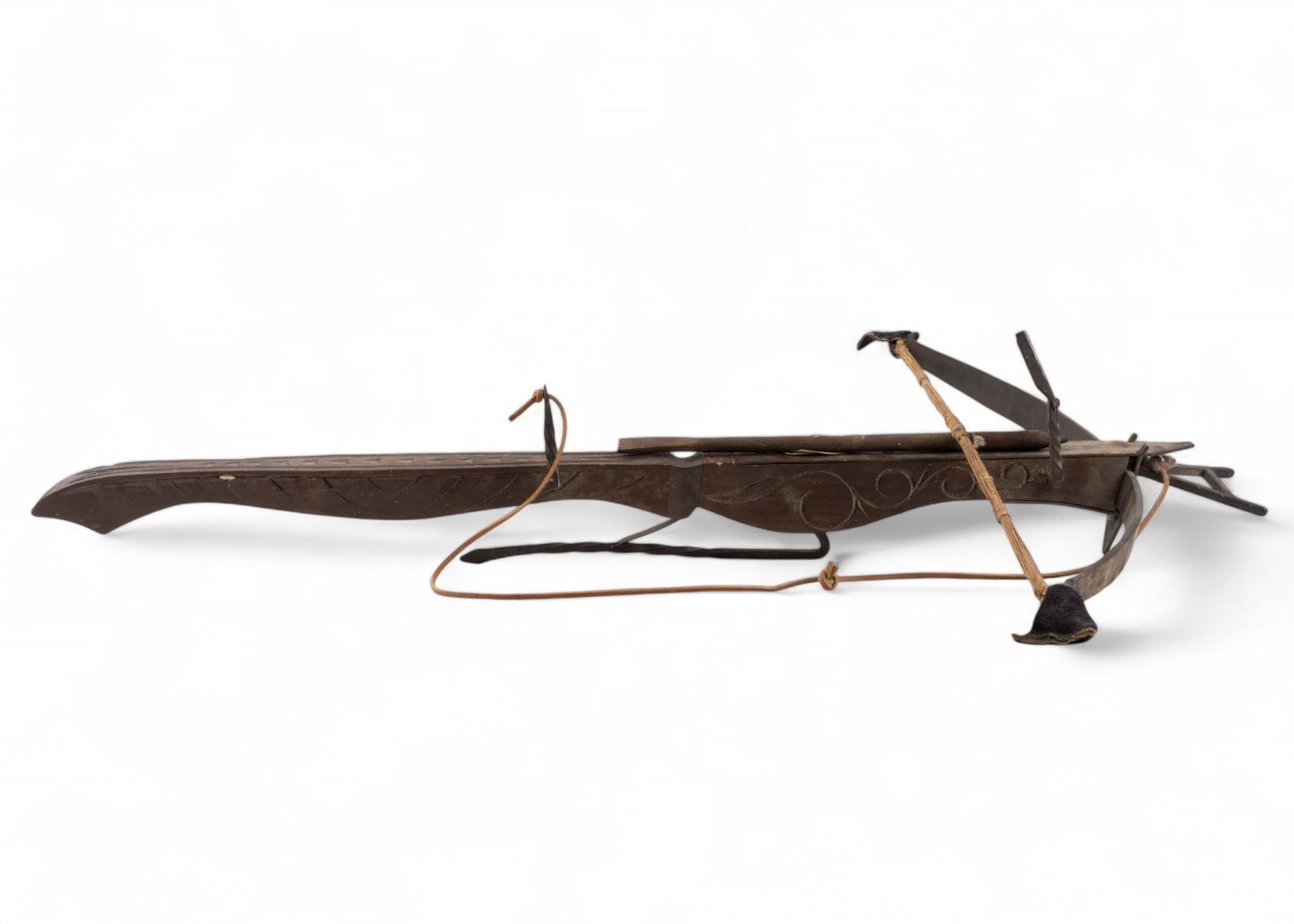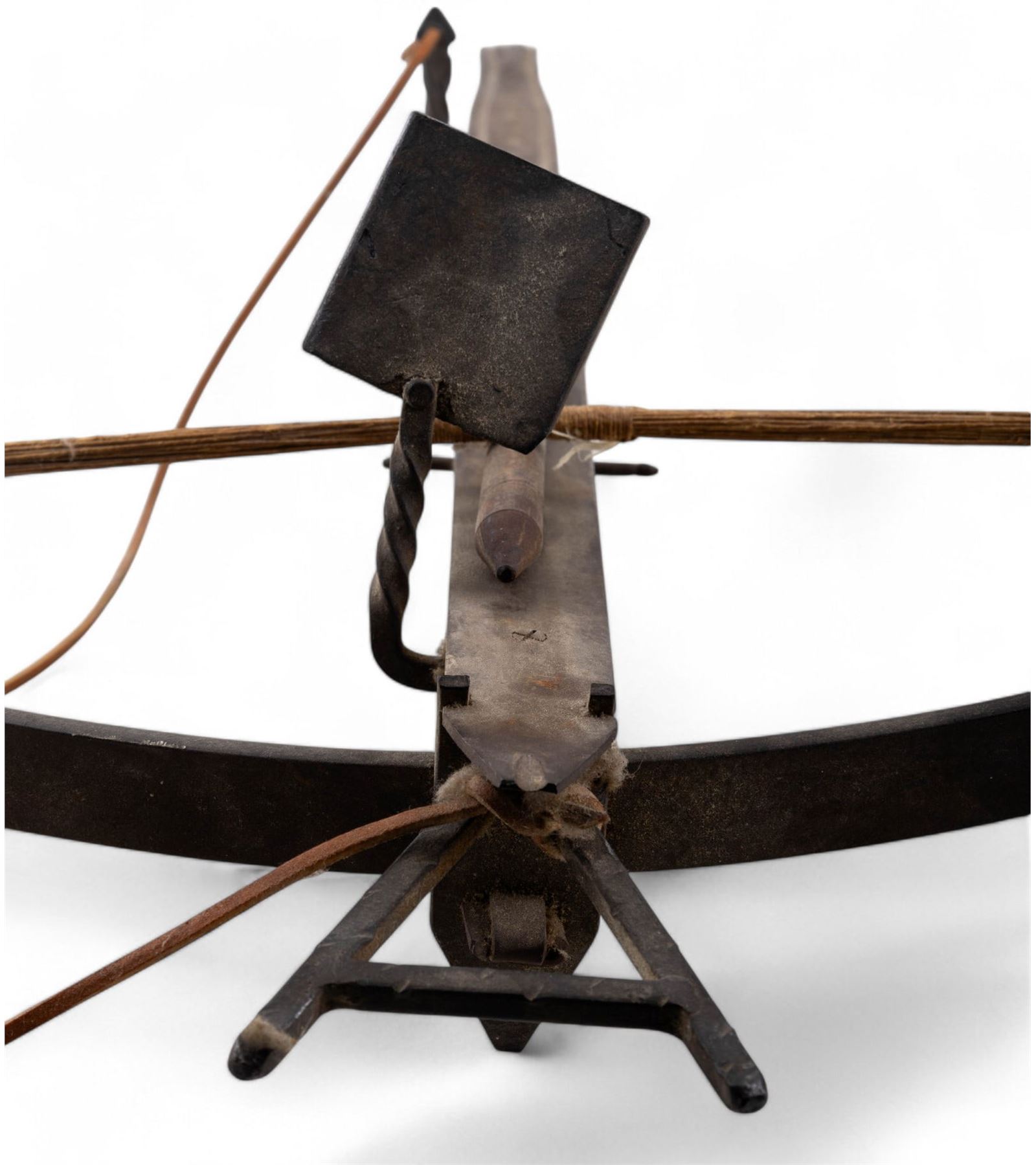 Continental antique crossbow, passably functional w/ early bolt. Item measures approx. 31.5" long & 24" wide.